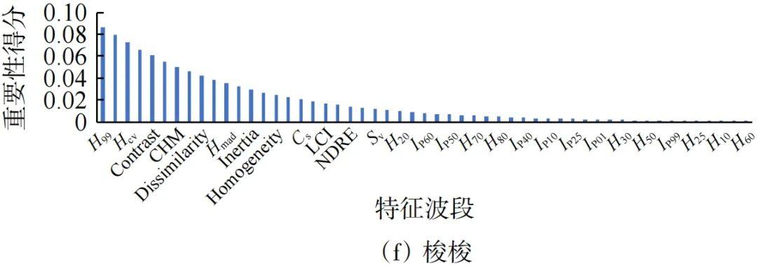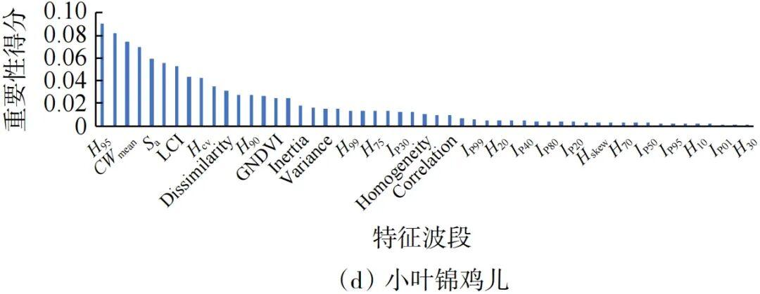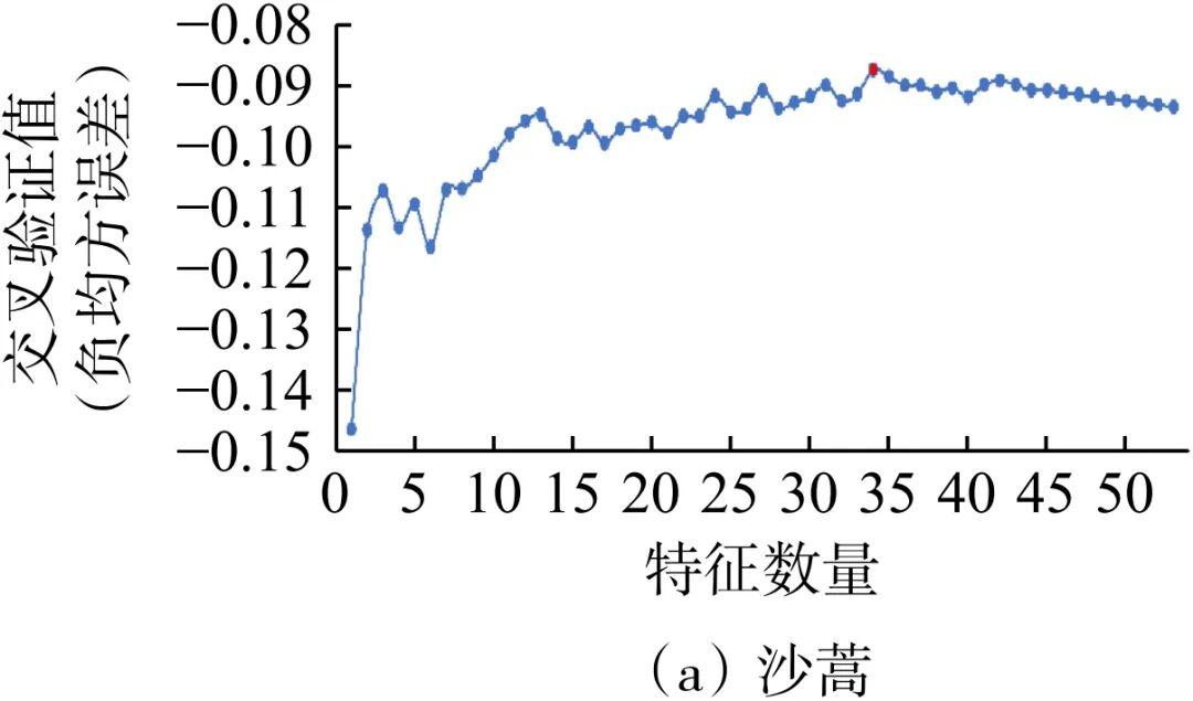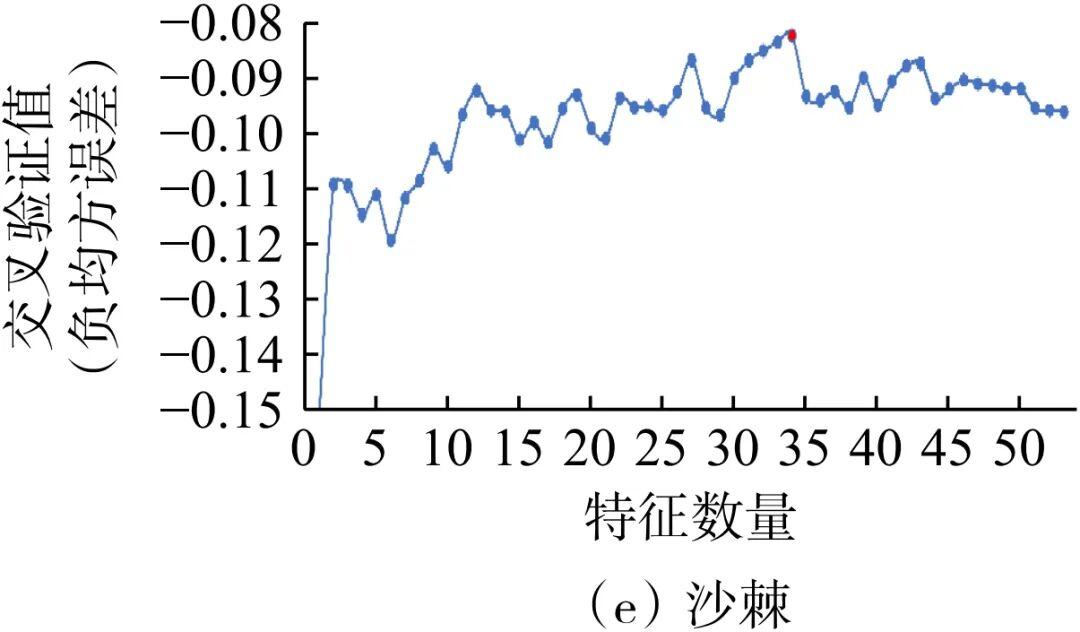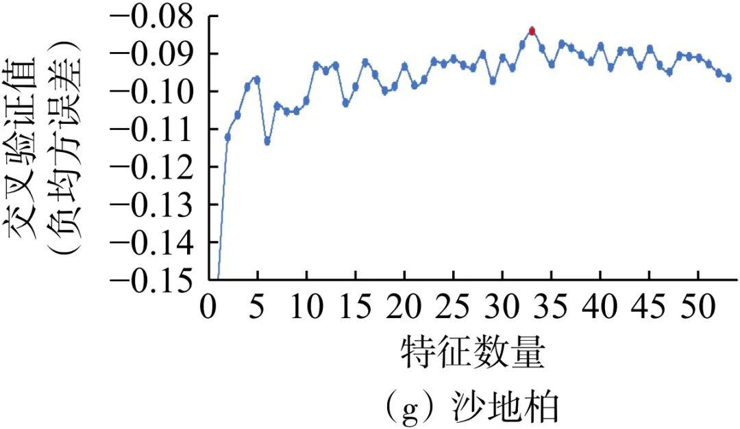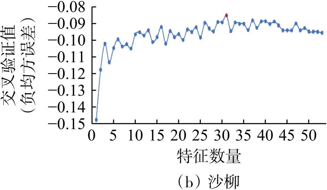 綜合光譜、植被指數、紋理及點雲結構特徵,共提取58個候選變量,採用RF−RFECV特徵優選策略,篩選出各物種對應的最優特徵子集(圖3、圖4)。結果表明,不同灌木物種對特徵維度的依賴程度存在顯著差異:沙柳的模型複雜度最高(需37個特徵),而小葉錦雞兒的模型最爲精簡(僅需25個特徵)。