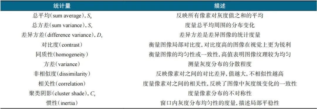 爲表徵高分辨率影像的空間異質性,在對多光譜波段與植被指數進行主成分分析後,選取第一主成分(方差貢獻率>0.89)計算GLCM紋理特徵。最終選取10個常用統計量作爲紋理特徵變量(表2)。