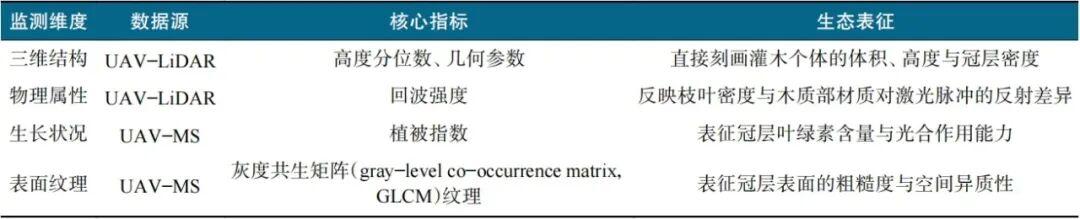 無人機(UAV)低空遙感技術爲解決上述問題提供了新路徑。無人機多光譜(UAV−MS)可提供高分辨率的光譜與紋理信息,但在處理“異物同譜”現象時識別能力不足。無人機激光雷達(UAV−LiDAR)則能穿透冠層,直接獲取植被的三維垂直結構參數,但缺乏光譜語義信息,難以實現物種的精準分類。因此,構建融合結構特徵、光譜特徵與紋理特徵的多源協同框架,充分發揮不同模態數據的互補優勢,是實現複雜環境下灌木生態資產精準反演的有效途徑。