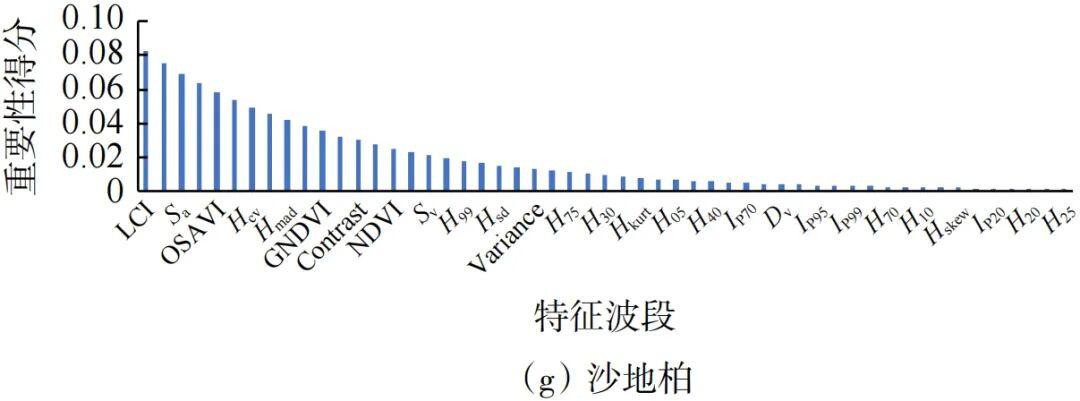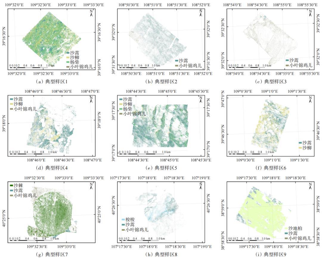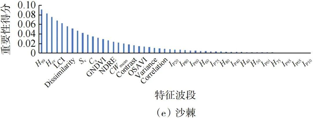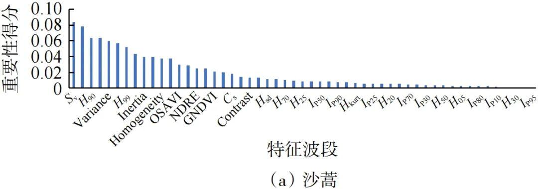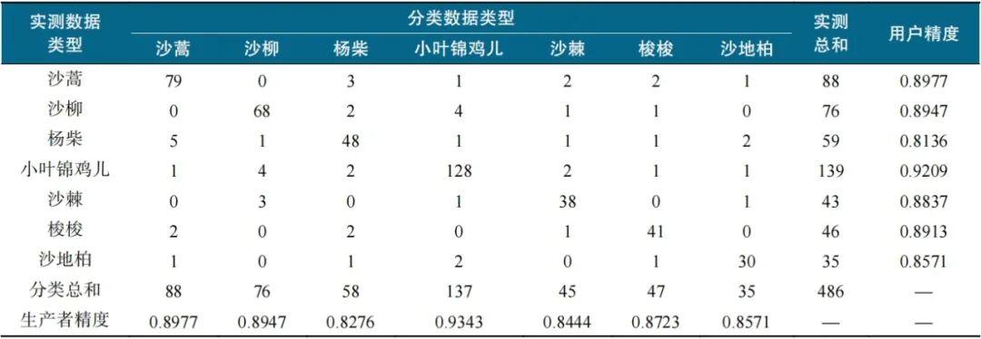 從物種層面看,小葉錦雞兒的識別精度最高,這主要歸因於其獨特的冠層紋理結構與光譜特徵,易於與其他物種區分。相比之下,楊柴的分類精度相對較低,主要表現爲與沙蒿、小葉錦雞兒的混淆。究其原因,一方面在於楊柴與沙蒿在生長季具有相似的光譜反射特性;另一方面,在植被覆蓋度較低的區域,裸土背景的強反射干擾了冠層邊緣的像元信號,導致分類器對形態相近的灌木產生誤判。