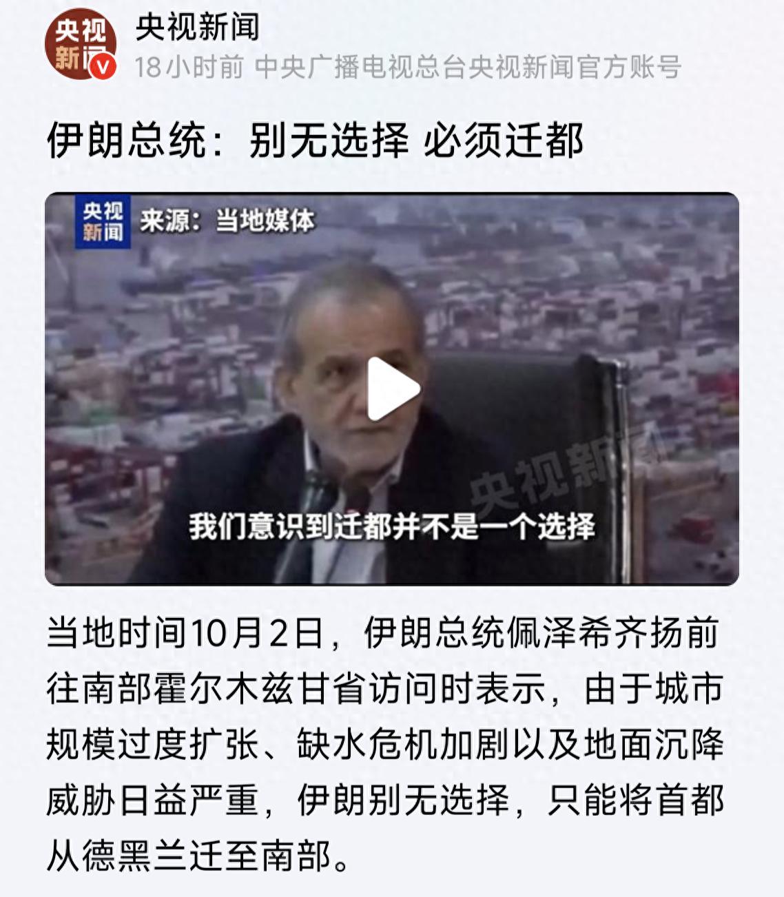 伊朗總統佩澤希齊揚表示:別無選擇,必須遷都。他給出的理由是首都德黑蘭面臨城市規模過度擴張、缺水問題加劇、以及地面沉降日益嚴重。所以伊朗沒得選,只能將首都從德黑蘭遷到南部。