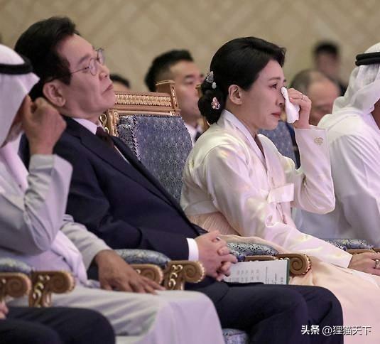 另外在這場晚宴觀看演出的時候,金惠景看得很投入,都流淚了拿着紙巾擦眼淚。旁邊的李在明卻看得睡着了,他靠着座椅閉上眼睛明顯是瞌睡來了眯了一會,這讓身旁的阿聯酋朋友不知如何是好,都用手扶額頭了。