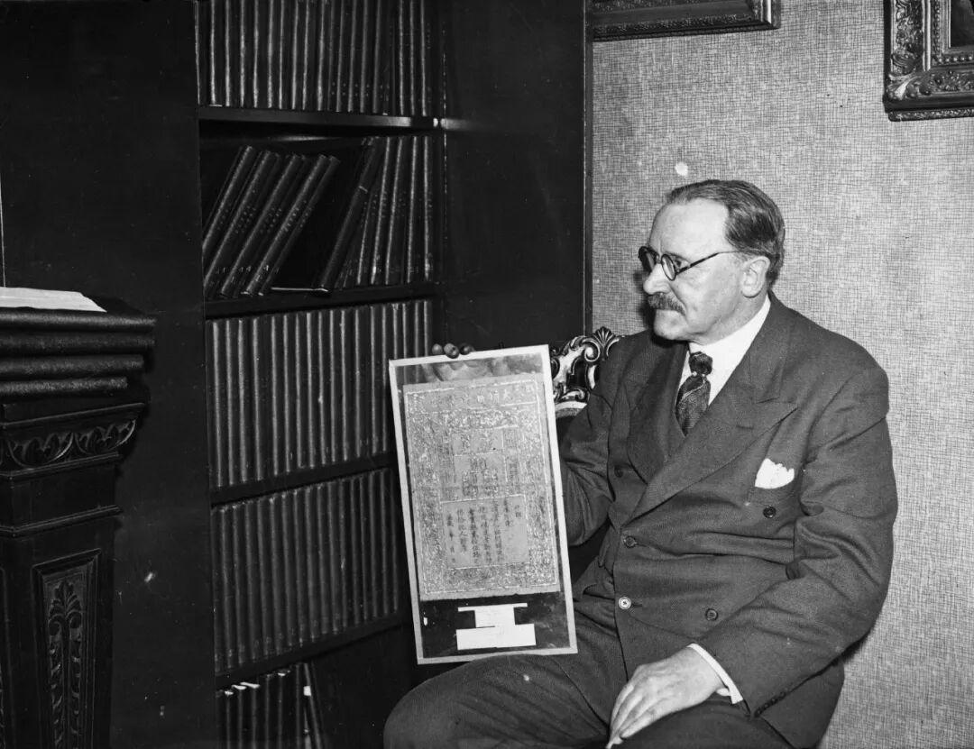 ▌1933年2月1日,英國倫敦,收藏家弗雷德·卡特林展示世界上最古老的紙幣。這張紙幣來自北京故宮,是一張中國紙幣。卡特林將他的紙幣收藏品保存在一個內襯石棉的鋼製保險箱中