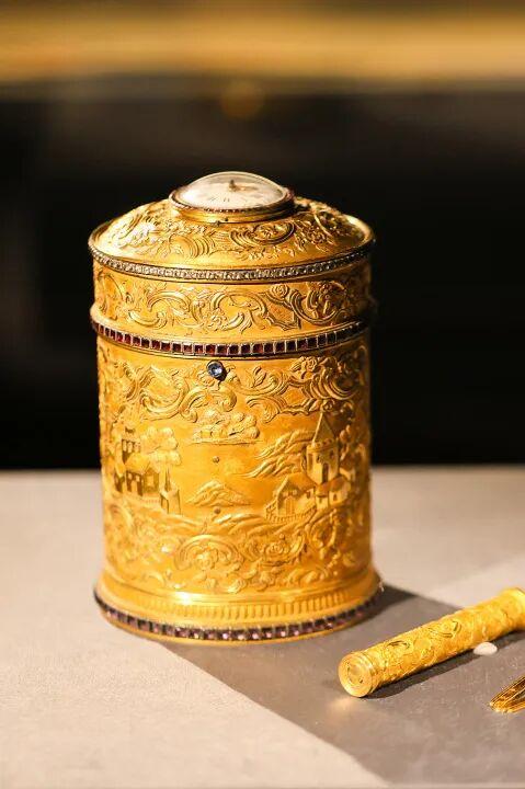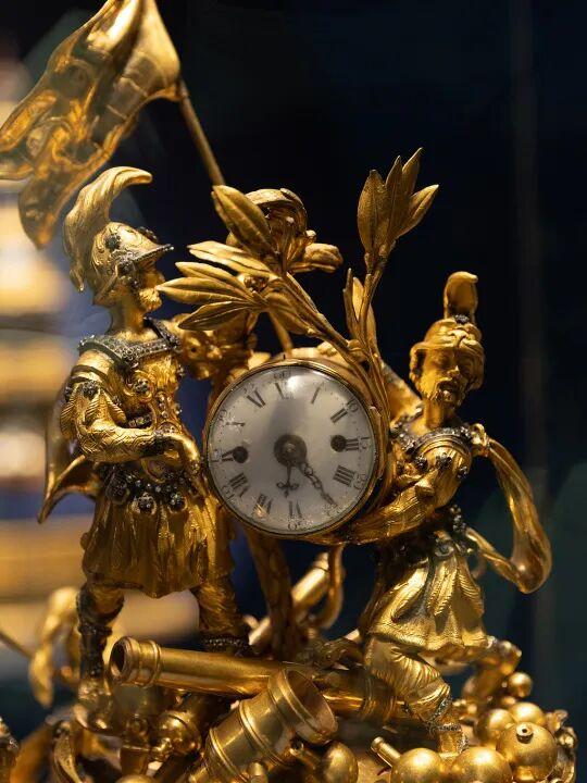 故宮鐘錶的繁複華美以及匠心獨具在乾隆時期達到巔峯,此時的皇家鐘錶收藏裏既有歐洲定製,又有宮廷改裝,旨在更富裝飾性及文化趣味。哪件是Top1可能各花各眼,倒是一件落選之作更有意思:這便是俄羅斯冬宮博物館的鎮館之寶,由詹姆斯·考克斯(James Cox)所做孔雀報時鐘。這是一隻禽鳥環繞的金色孔雀,腹中暗藏機械裝置,運轉時可實現開屏、鳴啼、眨眼等動態效果,金光流轉栩栩如生。出人意外,落選原因在於乾隆認爲其“繁複豔俗,失卻端莊”,可見文以載道、以器物承載禮制內涵仍然是皇家堅定的價值導向,並未曾因機械科技炫目而動搖。