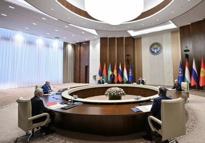合影之後,集安組織峯會召開了圓桌會議,6個人坐在圓桌的六個座位上還挺寬敞的,顯得距離遠。其實這個集安組織的全稱是獨聯體集體安全條約組織,成員主要是獨聯體國家,截止目前有6個成員國,包括俄羅斯、白俄羅斯、哈薩克、亞美尼亞、吉爾吉斯和塔吉克,這次亞美尼亞沒派人來,所以座位安排少了一人。