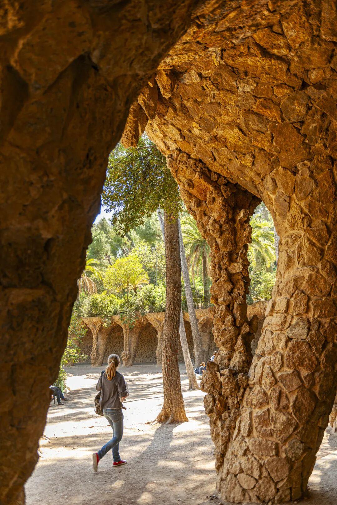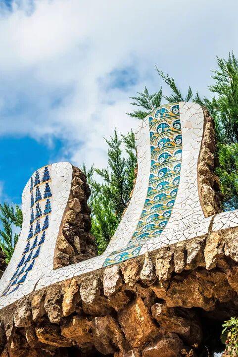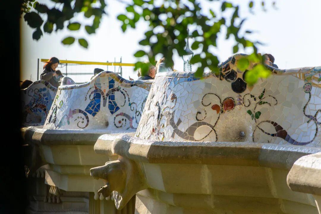 我疑惑公寓的選址是否真的可以讓當時的人們過上寧靜和健康的生活?當我站在古埃爾公園內最著名的“希臘劇院”廣場時便有了答案。這裏是園區內的制高點,可以盡覽整座巴塞羅那的城市風姿和地中海的壯闊。廣場周圍有如蛇形般蜿蜒的彩瓷長椅,用碎瓷磚拼貼出豐富的圖案,用色絢麗而大膽,它既是圍擋又是長椅,兼具藝術性和功能性。公園遠離鬧市區,周圍有茂盛的綠樹環繞,我想,在高迪生活的年代,這裏一定是一片世外桃源吧。