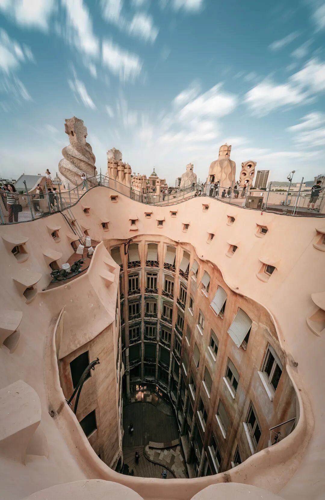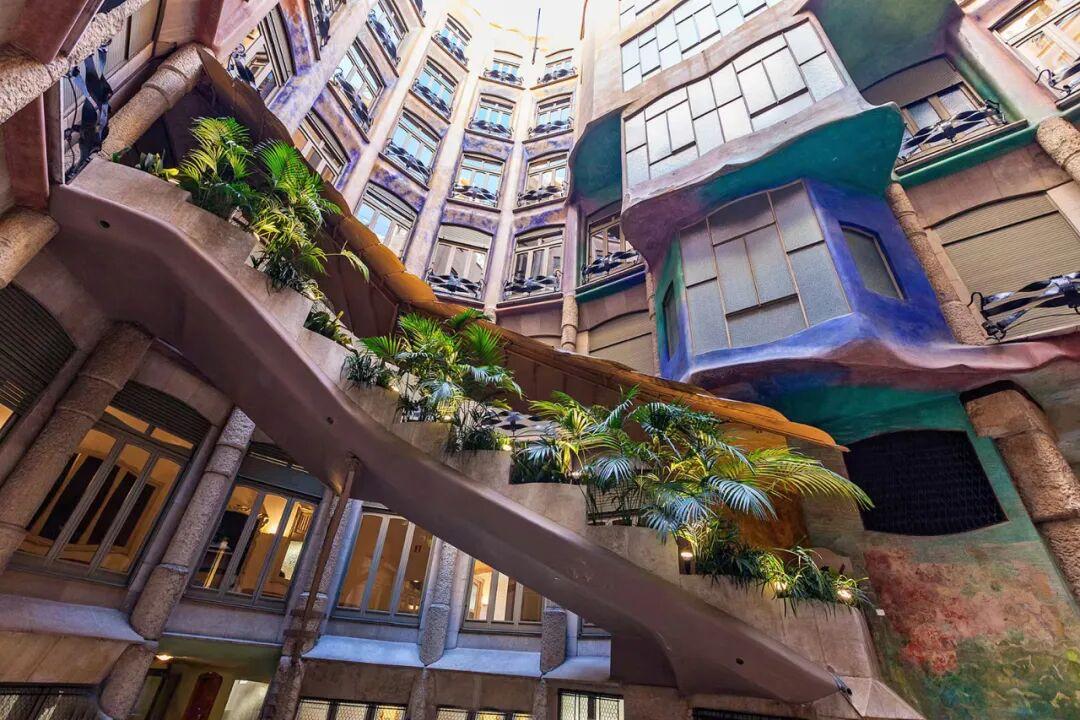 波浪形的外立面凹凸起伏,如水般流暢舒緩,詮釋了一種流動美感。從中庭抬頭望上去,仔細看這些錯落有序的房間,它們都是雙面採光,光線從中庭和外面的街道照射進來,室內不用藉助燈光也格外明亮,高迪說:“建築就是對光的協調,光是最好的盟友。”這也是高迪秉持大自然元素的重要體現。
