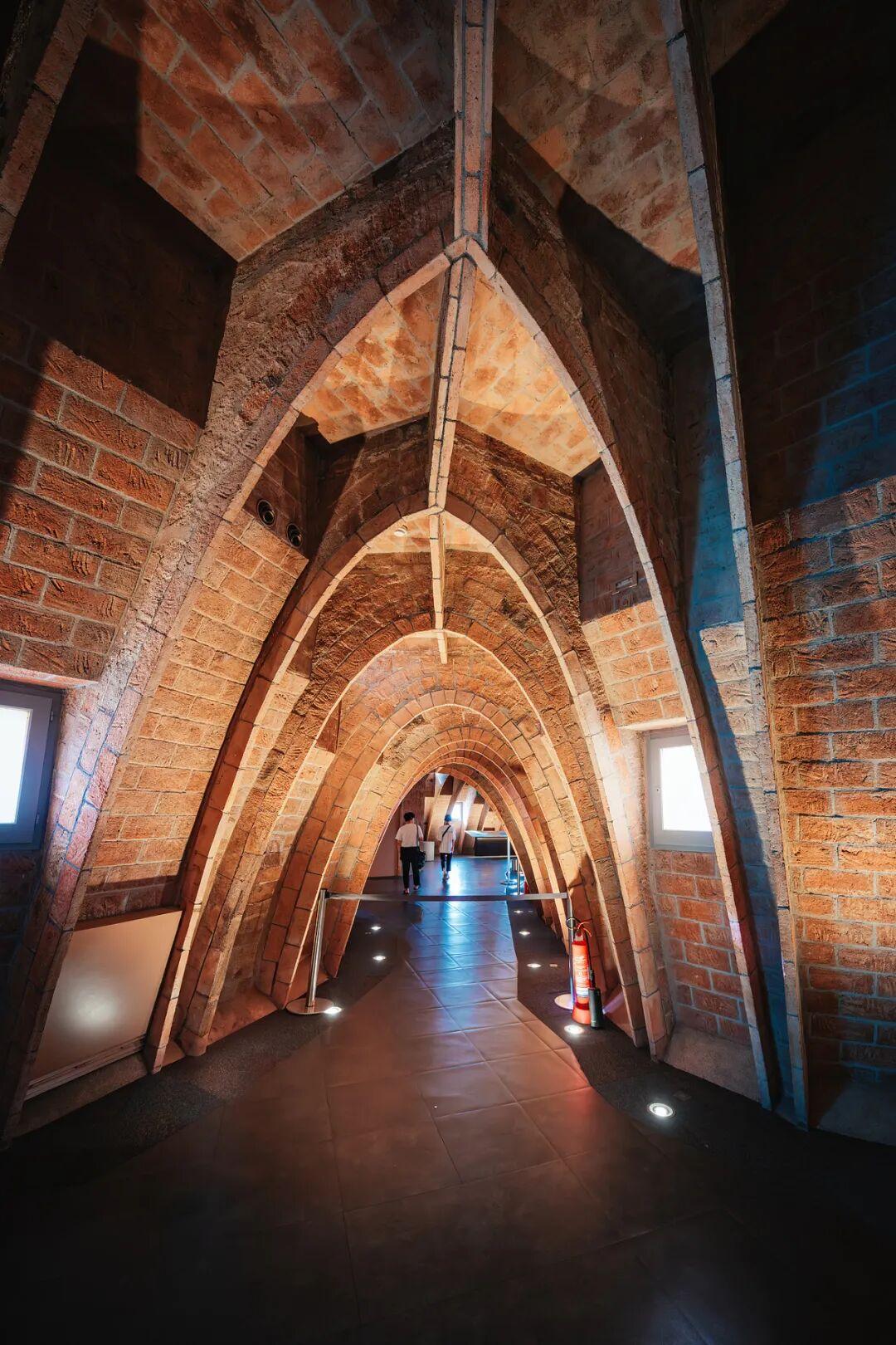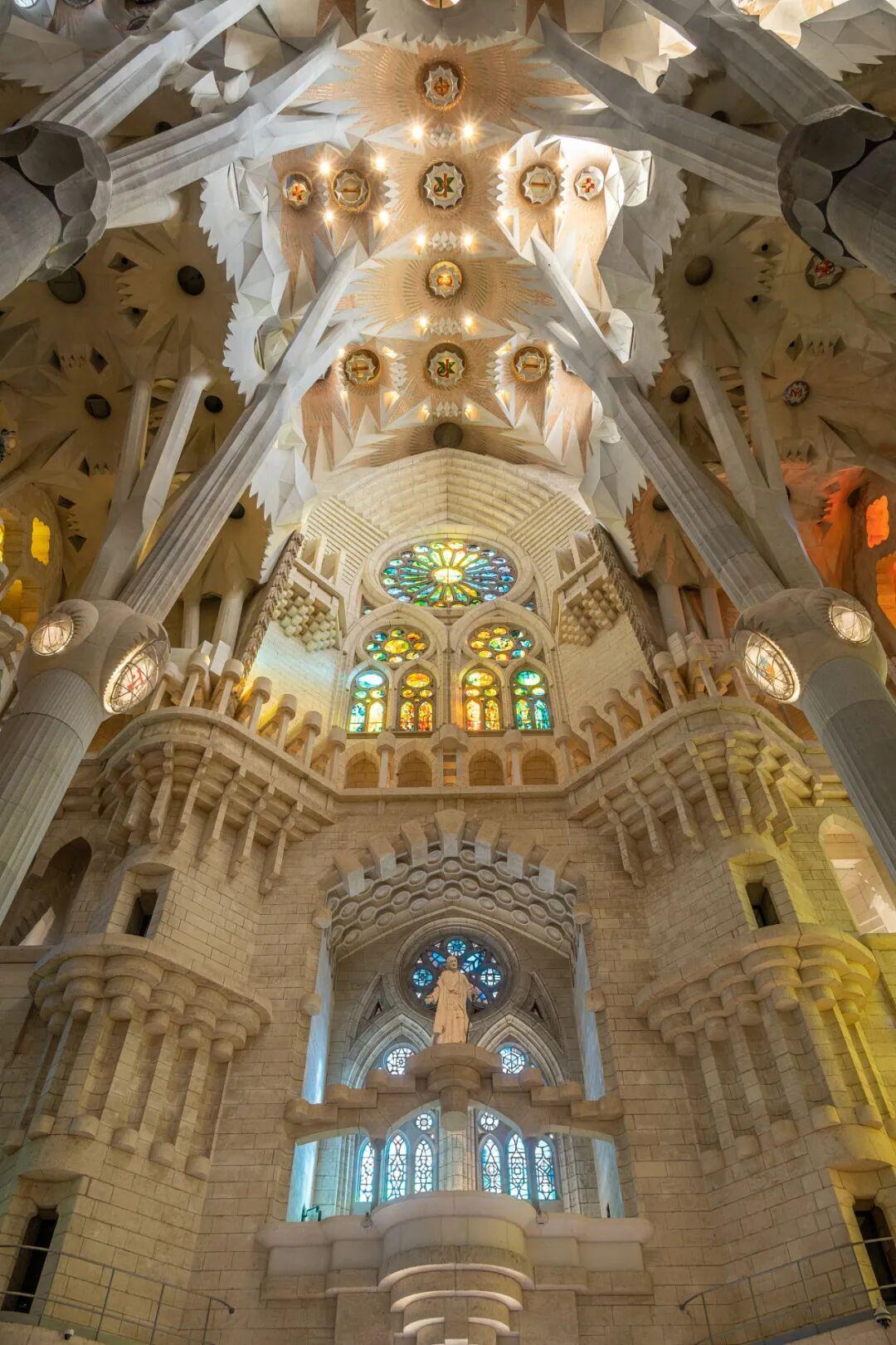 雖然聖家堂也被稱爲“光之殿堂”,豔陽高照時陽光透過彩色玻璃投射到教堂內部,形成一個絢麗斑斕的光影世界。遺憾的是,我參觀聖家堂的時候是陰天,光影並不充足,教堂內部幽暗,兩側柱林所形成的空間,帶給我的感受與其說像森林,不如說更像幽深的縱谷。我在“山谷”中矗立靜思,突然想起《聖經》中的一句話,大意是:“當我獨自走入黑暗的幽谷,我不會感到恐懼,因爲我知道神與我同在”。那一刻,我仰頭望着聖家堂高聳的穹頂和繁密的柱林,我覺得自己是無畏恐懼、充滿力量的。