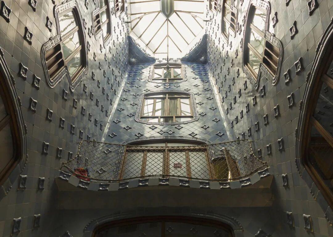 公寓的天井是帶給我最強烈震撼的部分,天井內貼滿了藍色的馬賽克瓷磚,不仔細觀察甚至很難發現,從下到上顏色逐漸變深,被樓梯一側的水紋樣的玻璃映襯,彷彿置身於波光粼粼的海洋之中,而碧藍的海水就在你的眼前湧動。旁邊的天井通風口,高迪更是受到了魚鰓活動的啓發,設計成可以擺動的樣式。這樣兼具趣味性與實用性的設計在公寓內隨處可見。