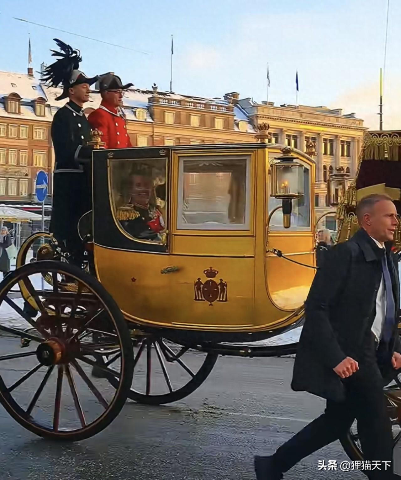 現在丹麥正在爲格陵蘭島的事情擔憂,丹麥國王和王后對此不操心,他們出行還坐在富麗堂皇的馬車裏,前面還有好多白馬騎士領路,丹麥國王和王后就在馬車裏跟路人打招呼,這就是他們的出行方式。