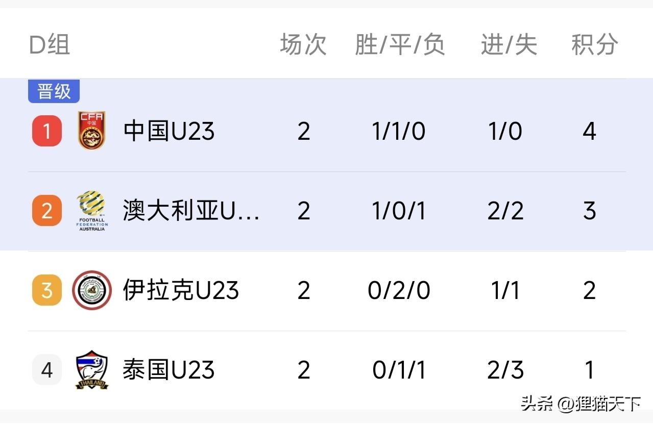 最後是目前還沒結束的D小組,暫時排名第一的是國足U23,目前有4積分。緊隨其後的是澳大利亞U23,目前有3積分,第三是伊拉克U23,第四是泰國U23。