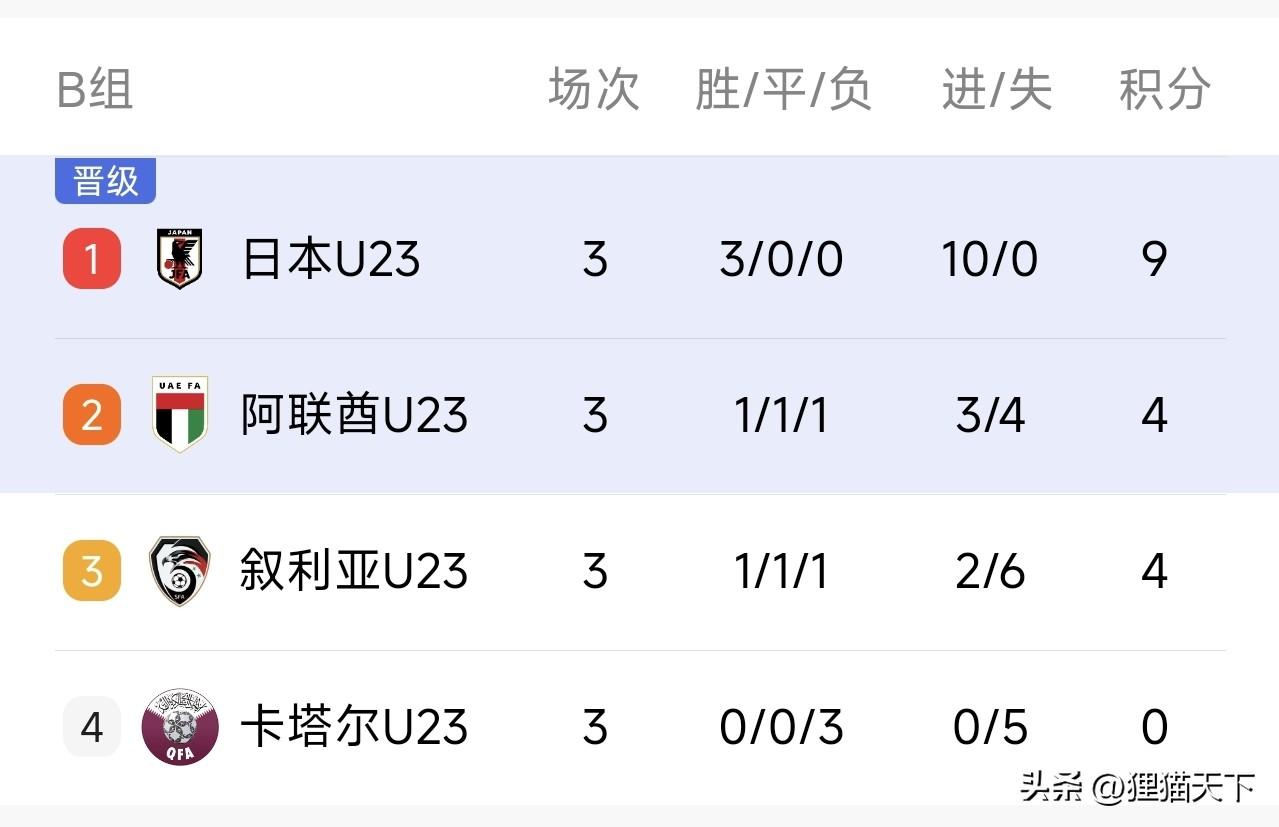 在B組當中,日本U23隊排名第一晉級淘汰賽,阿聯酋U23小組第二也順利晉級,敘利亞U23雖然也是4個積分排名第三,因爲淨勝球少於阿聯酋,還有卡塔爾U23小組賽3連敗墊底出局,比想象中的更弱。
