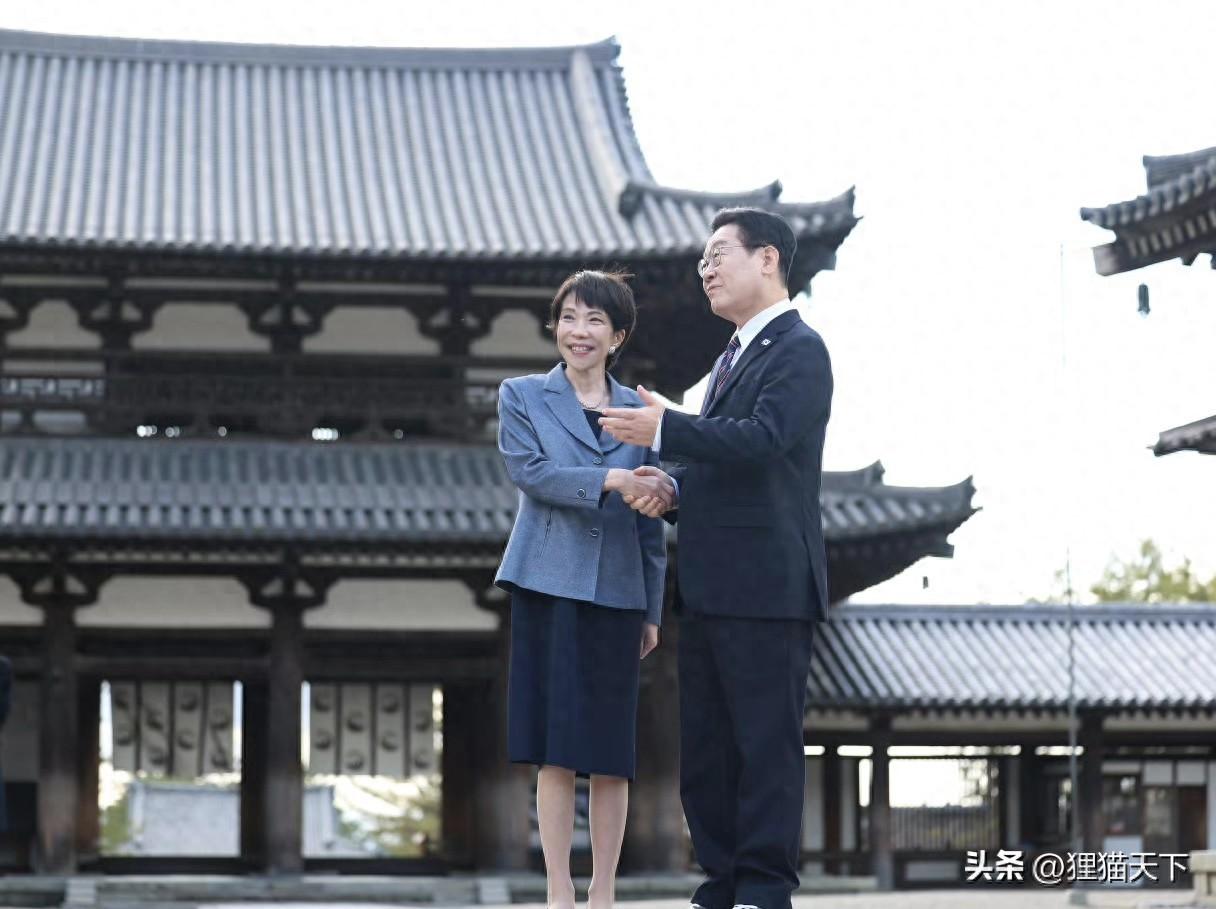 一大早,李在明與高市早苗一起去了日本奈良縣的世界文化遺產。他們一邊駐足參觀古建築,一邊做文化交流活動,還拍了一組和諧的照片,兩人還握着手,就跟擱這兒拍畫報一樣。