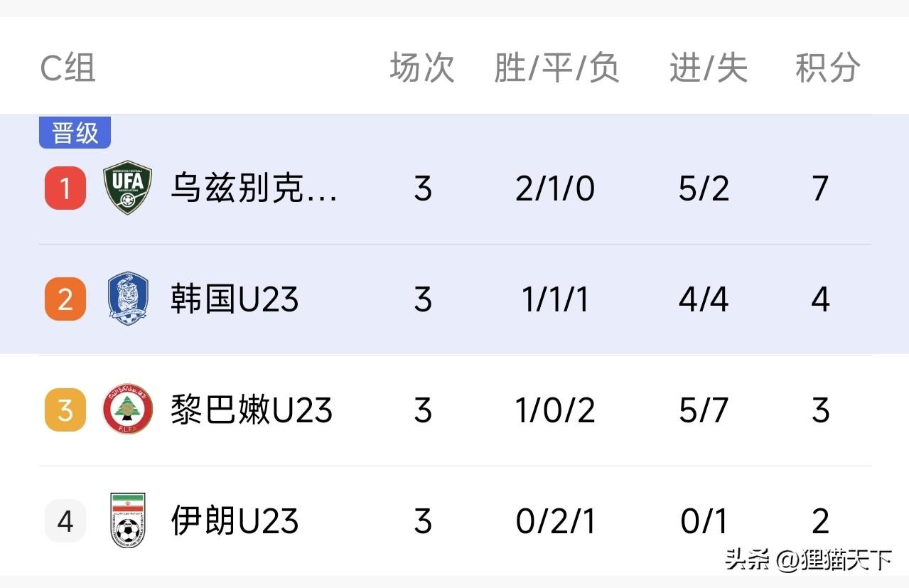 再看C組,烏茲別克隊小組第一力壓韓國隊,這一組整體實力都很強,就連伊朗U23居然都小組墊底淘汰出局。而且伊朗隊三場比賽0勝0進球,這是很罕見的。韓國U23隊1勝1平1負積4分晉級淘汰賽,這支韓國隊實力下滑,他們的球員平均年齡比烏茲別克隊大兩歲,以大打小居然還0-2輸了,可見實力不濟。