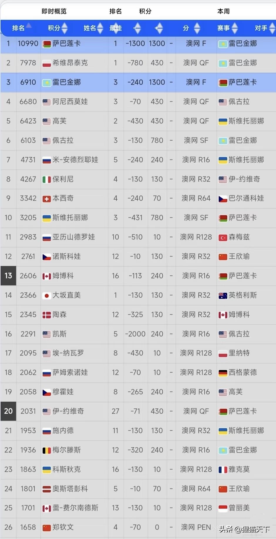 目前在網球女單實時積分榜上,薩巴倫卡的積分有10990分,遙遙領先其他選手。第二名斯瓦泰克有7978積分,與第三名拉開了將近1000積分的差距。第三名萊巴金娜有6910積分,她是從第五名升上來的,如果奪冠就能縮小與第二名的差距。