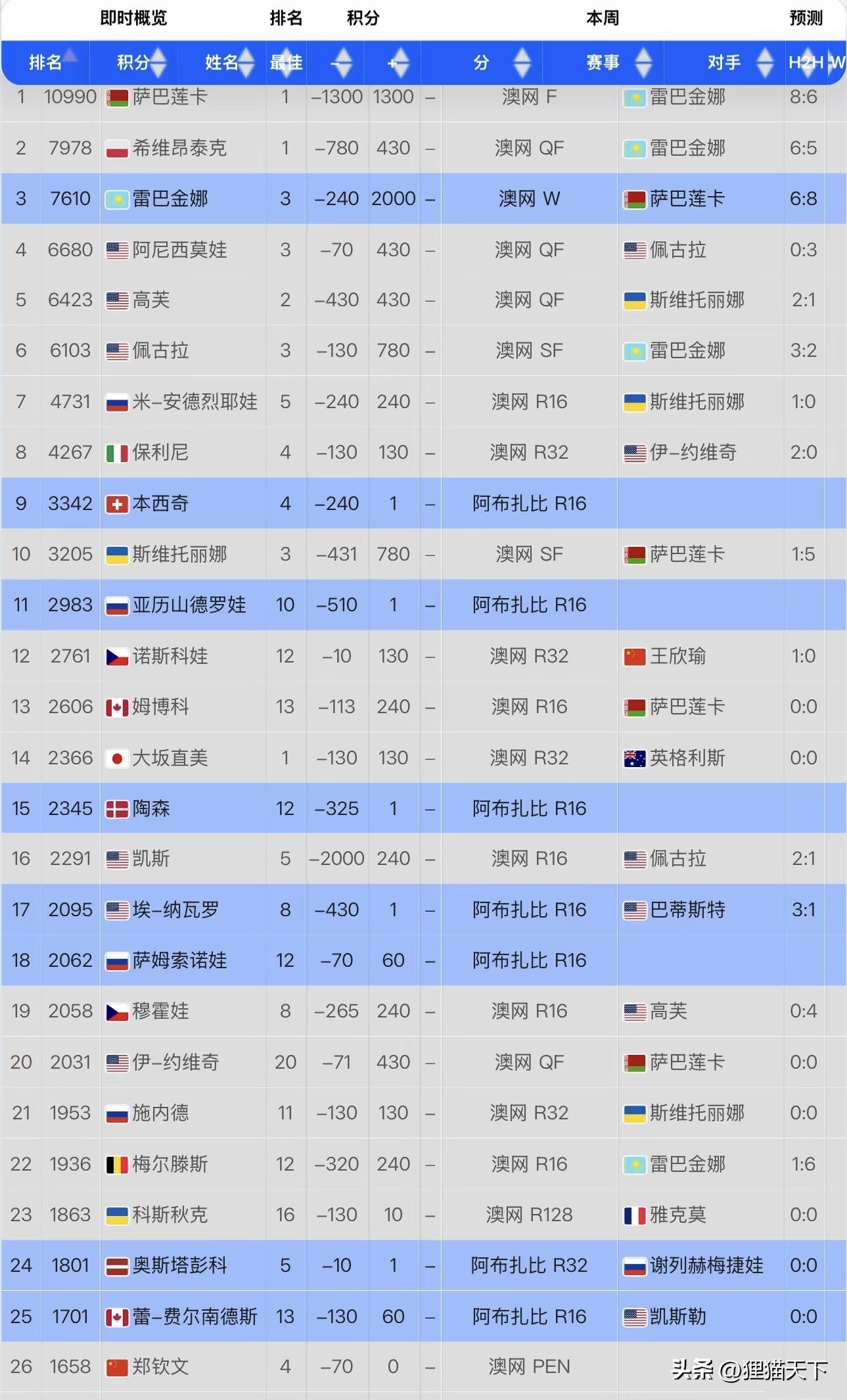 另外在年終總決賽積分榜上暫列第二的是薩巴倫卡,雖然她屈居第二,但她的表現也很穩定。薩巴倫卡和萊巴金娜都是新生代能扛起大旗的選手,兩人風格一個外向,一個內斂,都很受觀衆喜愛。