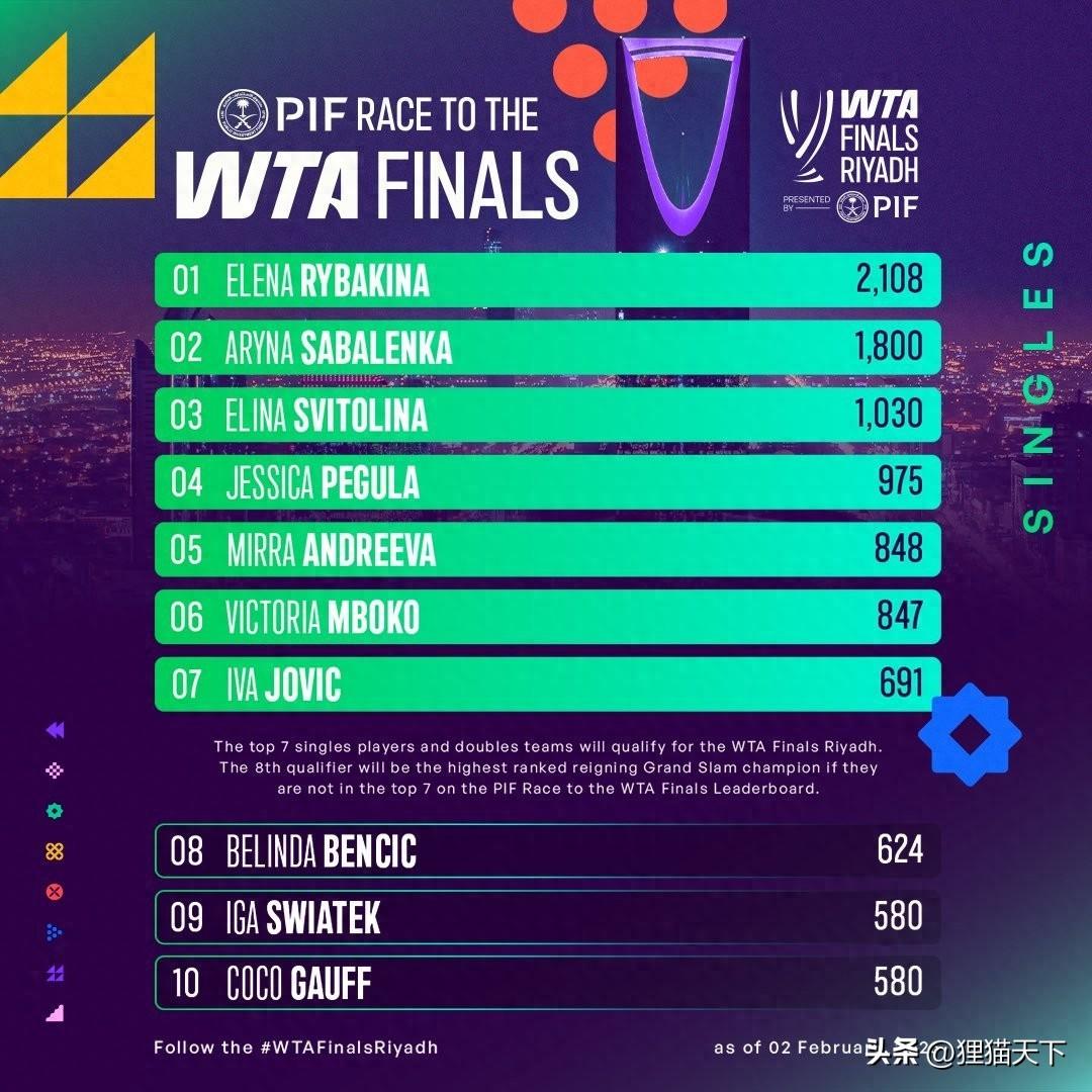 澳網比賽結束之後,利雅得WTA年終總決賽積分榜也更新了,這是隻計算2026年的積分,不算去年的。目前在年終總決賽積分榜前十的女單球員依次是:萊巴金娜、薩巴倫卡、斯維託麗娜、佩古拉、安德烈耶娃、姆博科、約維奇、本西奇、斯瓦泰克、高芙。