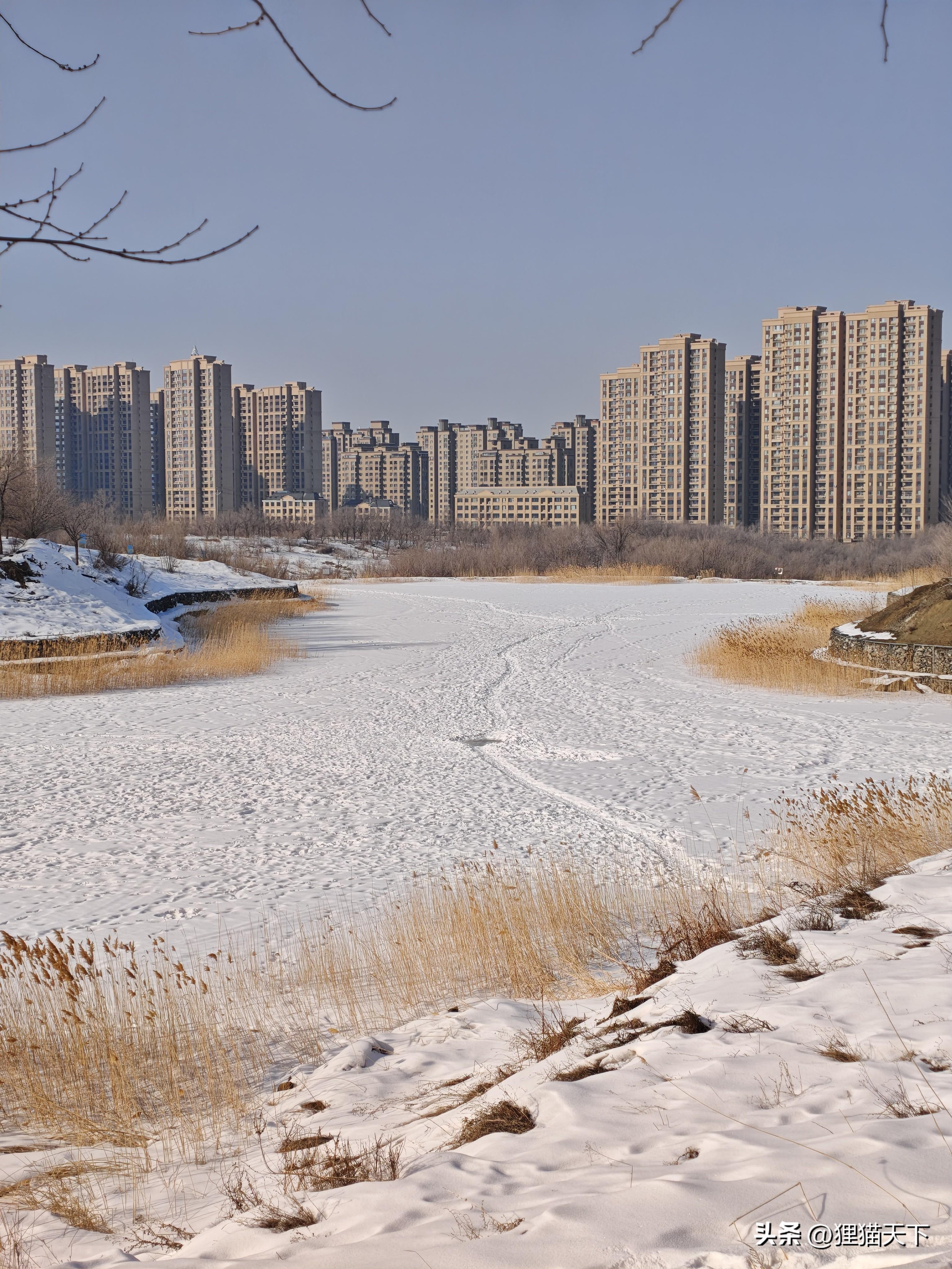 在柏油路走到又一個三岔口的時候,可以看到左邊的路上沒有雪,沿着這邊走會路過一個小湖泊,對面的高樓是保利西山林語,看着距離挺近的。