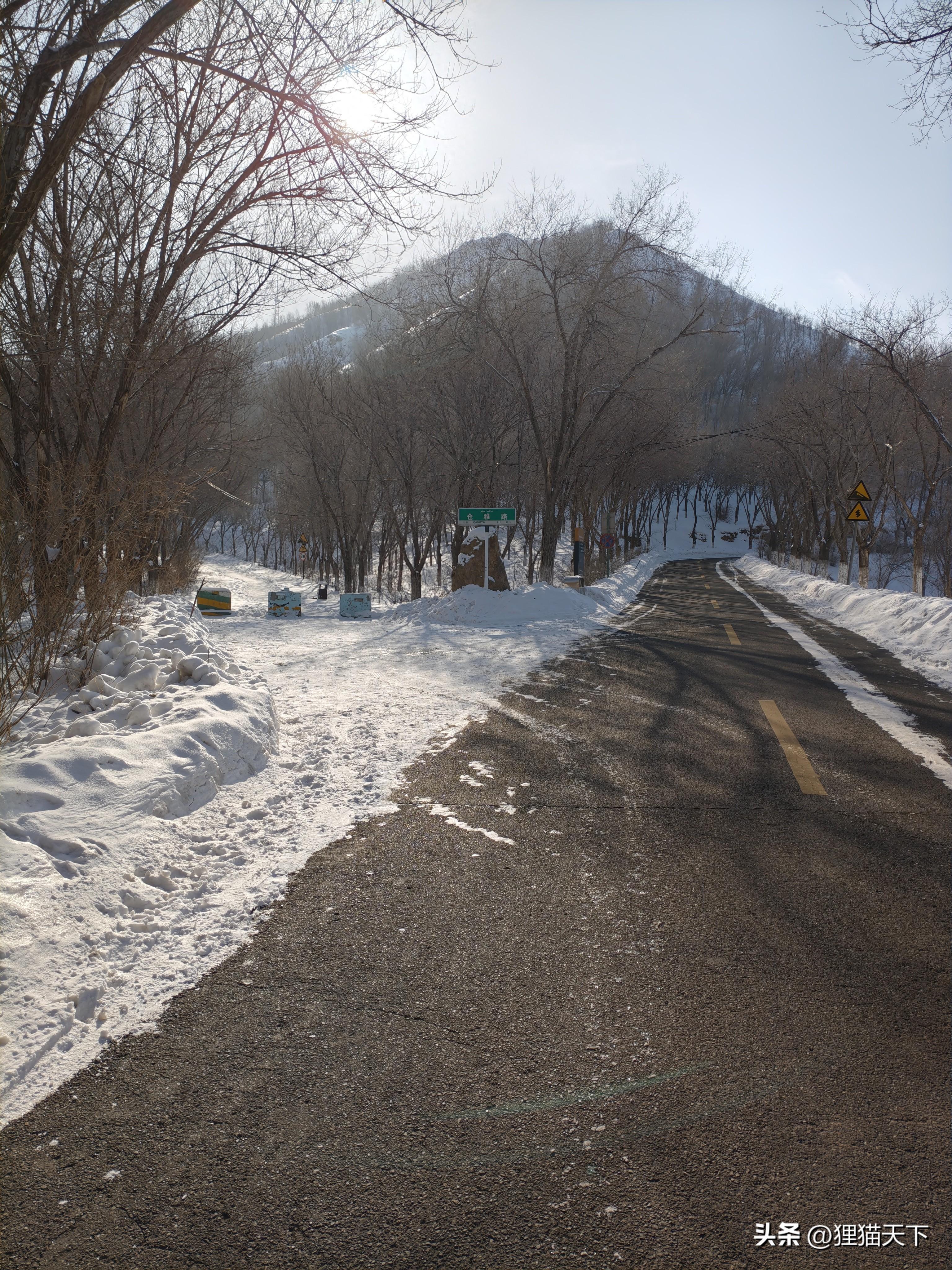 沿着柏油路走到倉雅路口,這裏往左通往雲滿臺方向的路上還有雪,可以繼續沿着沒雪的柏油路往下走。一路上看到樹林裏白雪皚皚,陽光透過樹林撒在雪地上,我想到了用靜謐來形容眼前的景象,此時一切都很安靜。