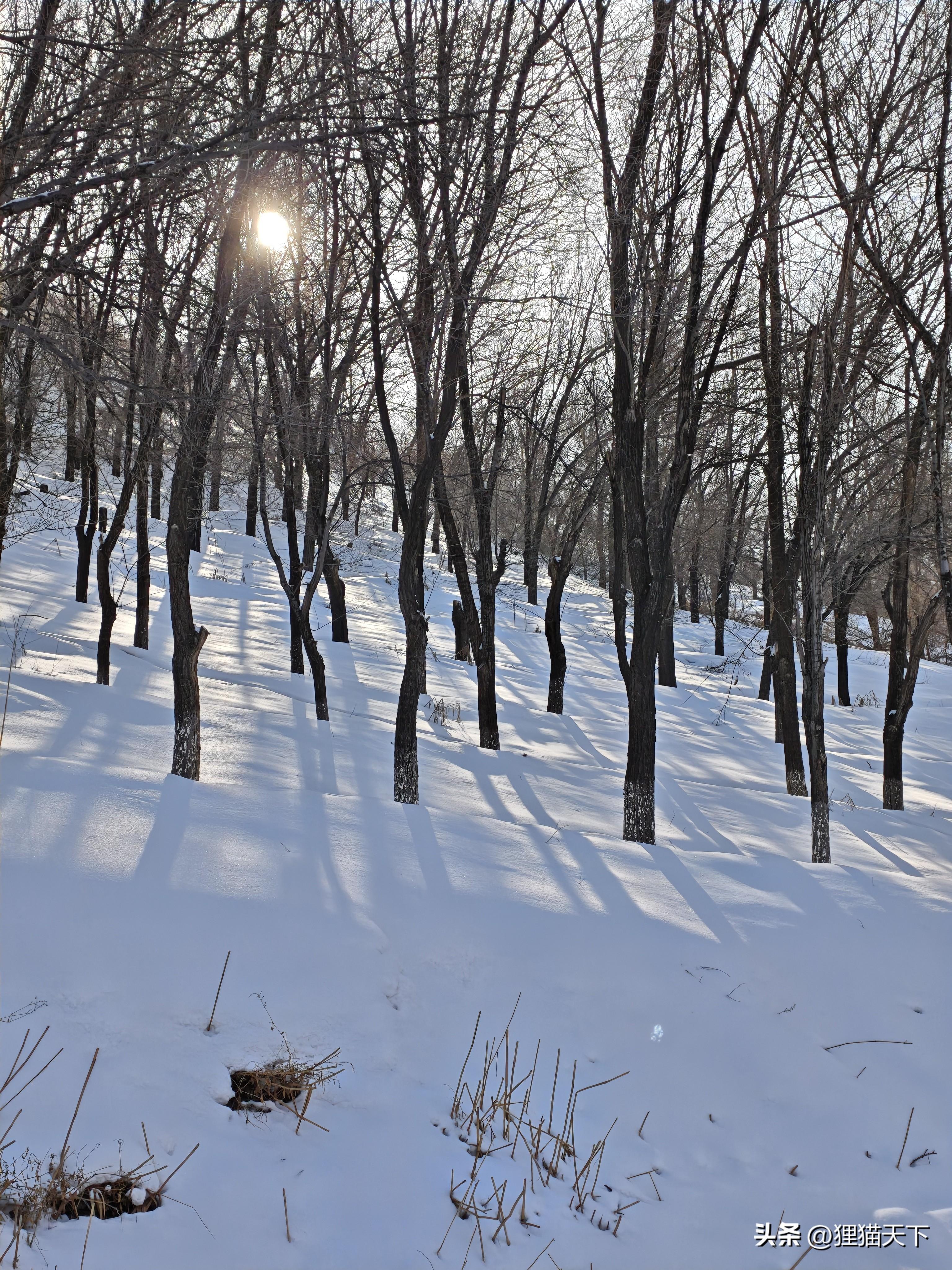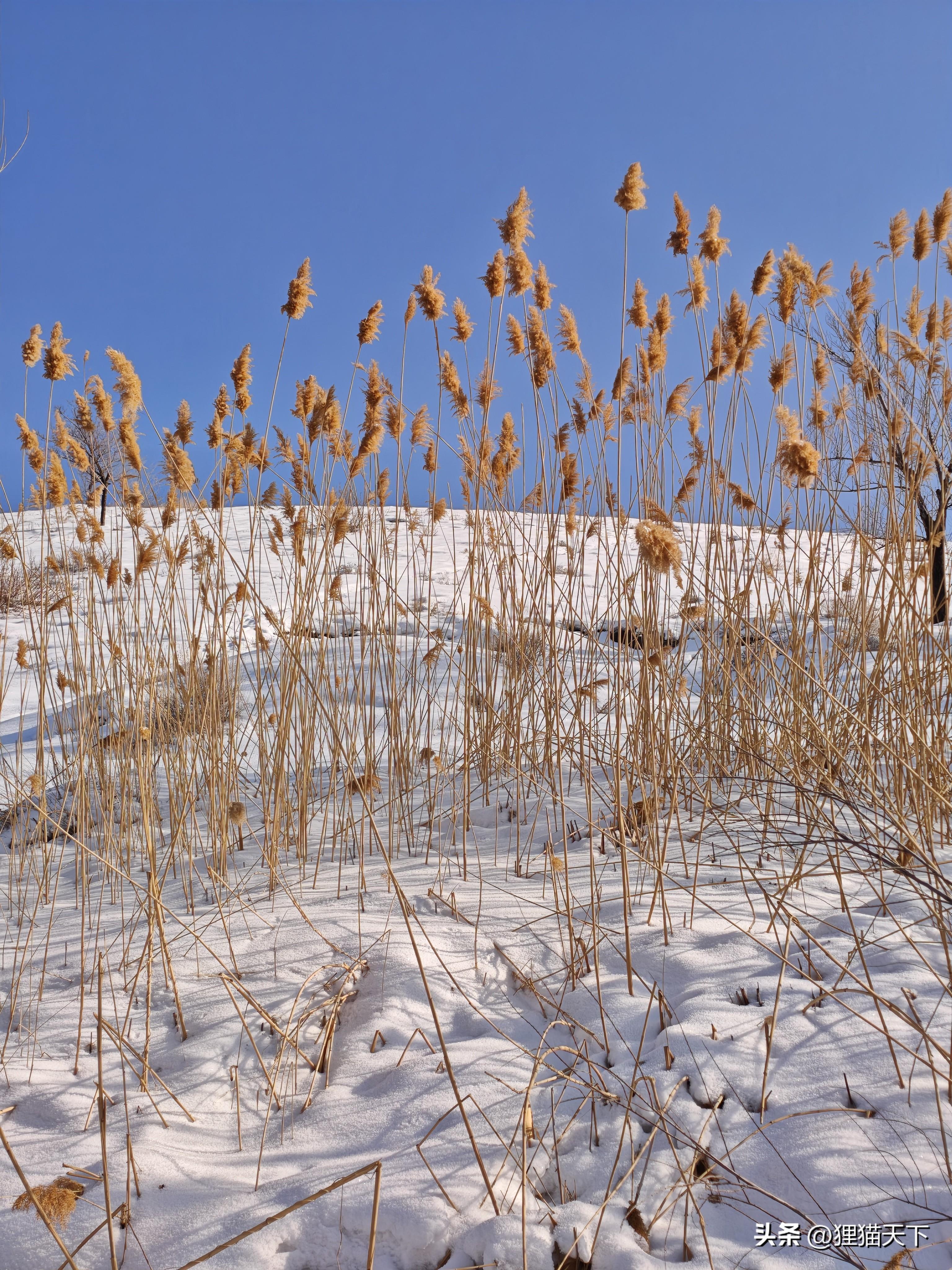 繼續往前能看到路邊山坡上的蘆葦,在藍天白雪的映襯下有了詩意,突然就想起蒹葭蒼蒼白露爲霜,這蒹葭說的就是蘆葦。