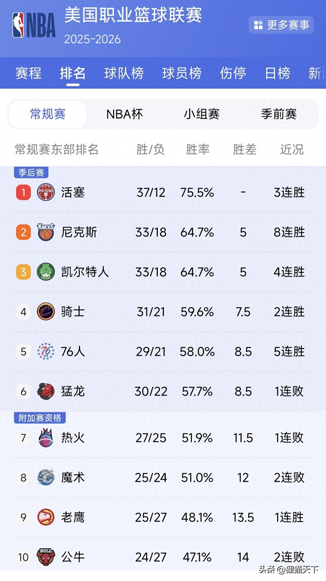 2025-2026賽季NBA常規賽已經比完了三分之二的賽程,現在到了各隊競爭激烈的階段。在NBA東部賽區排名第一的是活塞,目前底特律活塞以37勝12負的戰績排名東部榜首,勝率75.5%,領先第二名5個勝場,活塞隊只要繼續保持這個勢頭就能鎖定東部第一。