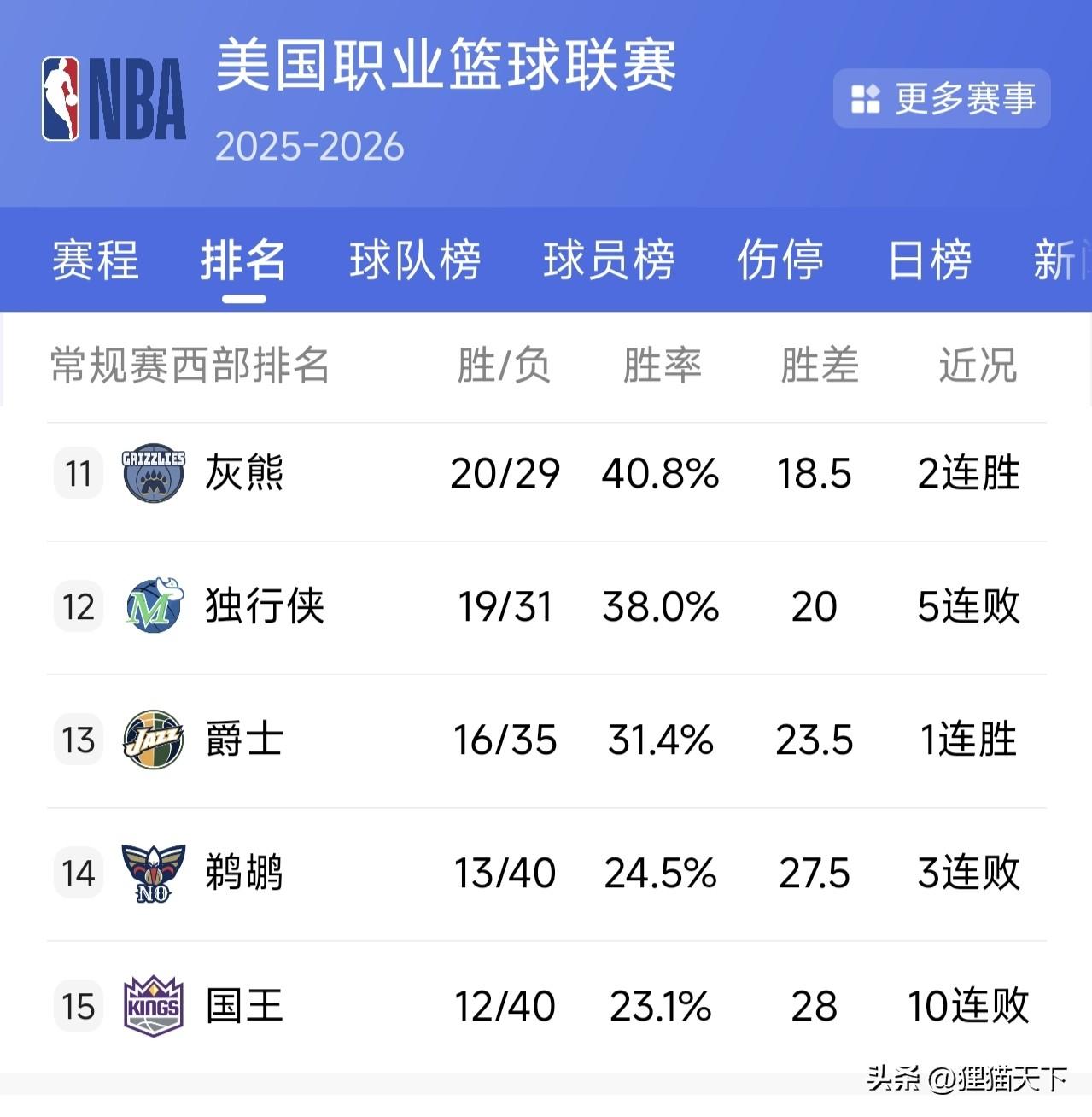 在NBA西部排名靠後的球隊當中,灰熊和獨行俠還有機會爭奪附加賽資格,爵士和鵜鶘、國王基本上就放棄了本賽季,只能爲樂透籤努力。特別是國王最近遭遇10連敗,排名墊底。