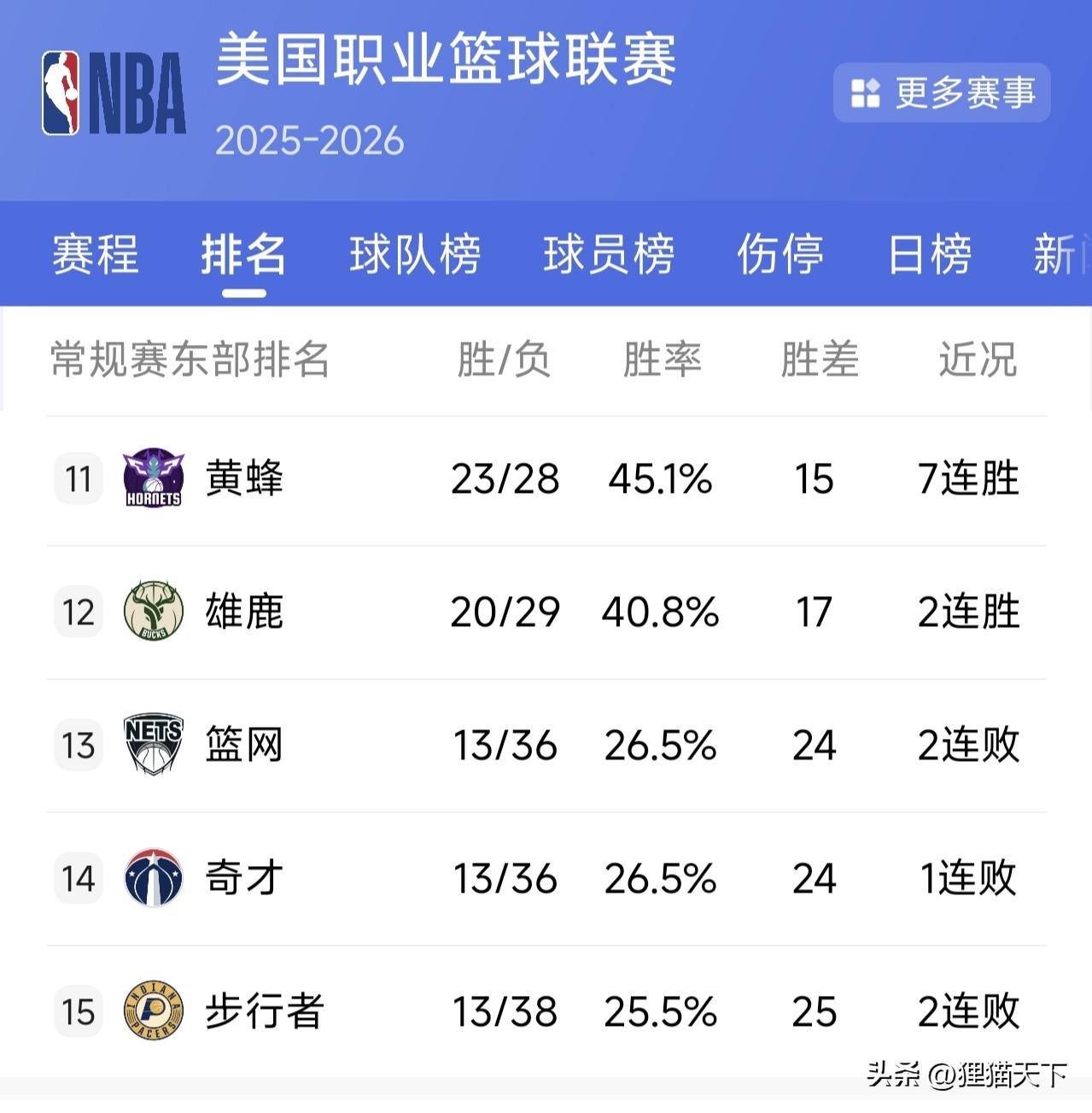 另外在東部排名靠後的五支球隊,黃蜂隊目前排第11,這支球隊最近7連勝實力回升,如果能延續狀態還有機會衝擊附加賽。雄鹿目前僅排在第12,再不努力也要掉隊了。還有籃網、奇才、步行者這三隊基本處於擺爛或球隊重建,本賽季已經無慾無求了。