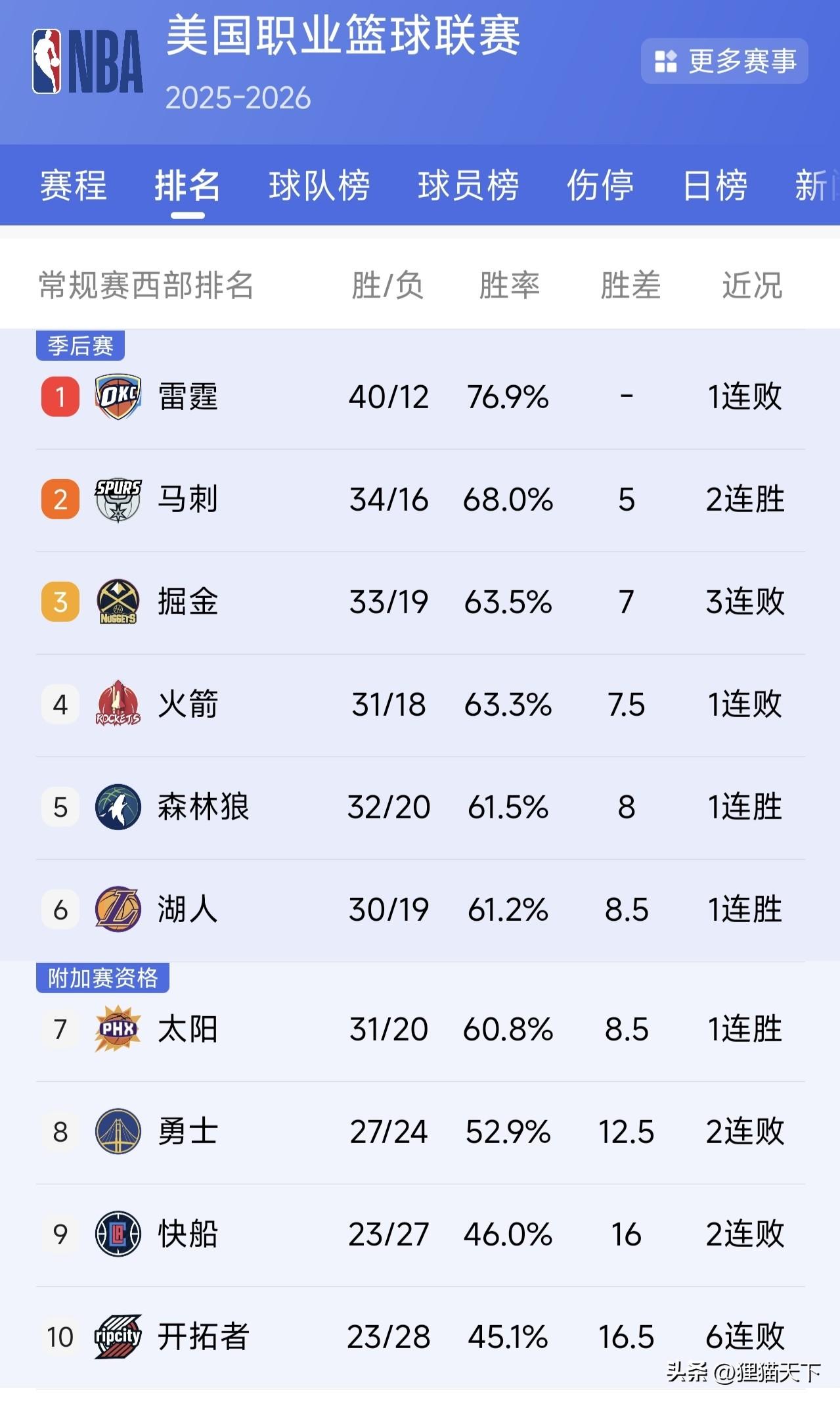 再看NBA常規賽西部排名,目前是俄克拉荷馬雷霆以40勝12負領跑西部,也是NBA全聯盟目前勝場最多的。排名西部第二的馬刺也表現不俗,目前戰績34勝16負。