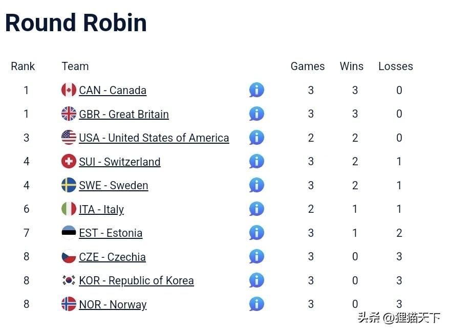 目前排名第三的是USA,並列第四是瑞士和瑞典,第六名意大利最近狀態不太行,第七是愛沙尼亞。第八名有三隊並列,包括捷克、韓國、挪威,這其中的挪威隊三連敗剛好輸給了前三名。