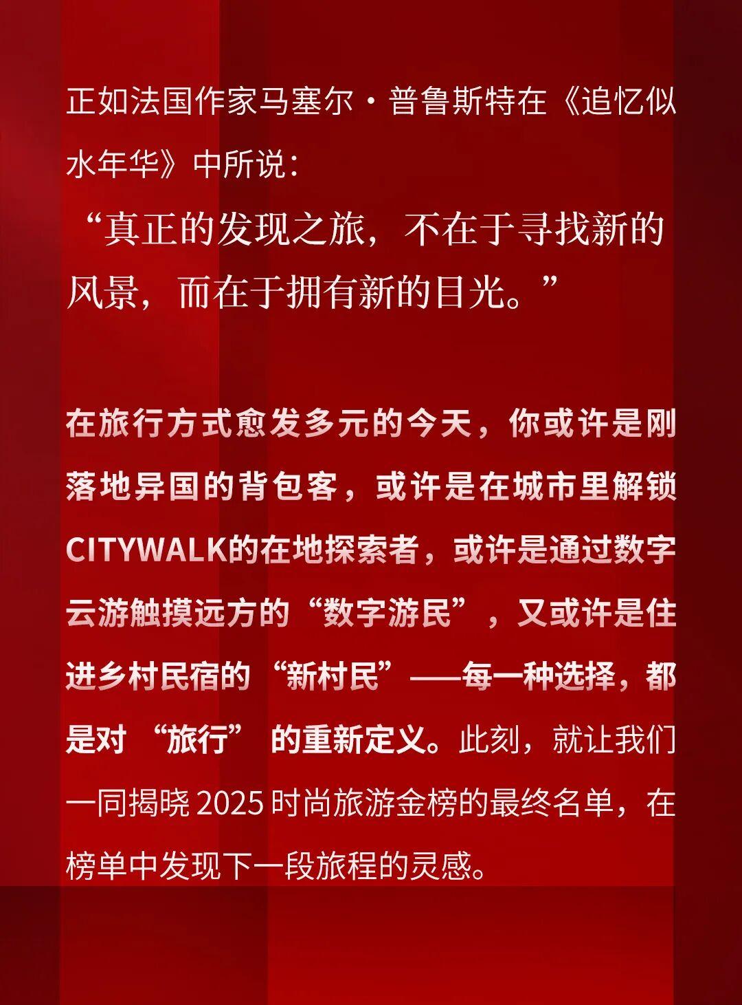 “旅行,至更美好的世界。” 這是《時尚旅遊》始終堅守的品牌信念。在2025年度時尚旅遊金榜的這份答卷裏,我們希望爲你梳理出值得奔赴的目的地與體驗,更喚醒你對旅行的深層思考:它不再只是 “去遠方” 的行動,而是在熟悉的街角發現陌生風景的敏銳,是在文化碰撞中理解世界的包容,也是在可持續探索中守護山海的責任。