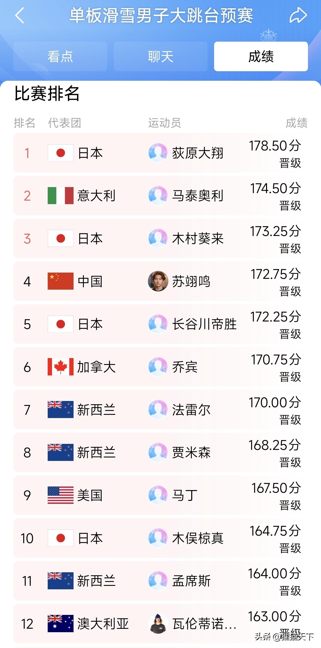 這次米蘭冬奧會男子單板滑雪大跳臺共有30名選手參賽,排名前12名的進入決賽。我國有三名選手參賽,只有蘇翊鳴進了決賽,他預賽排名第四,在他之前還有兩位日本選手和一位東道主意大利的選手。
