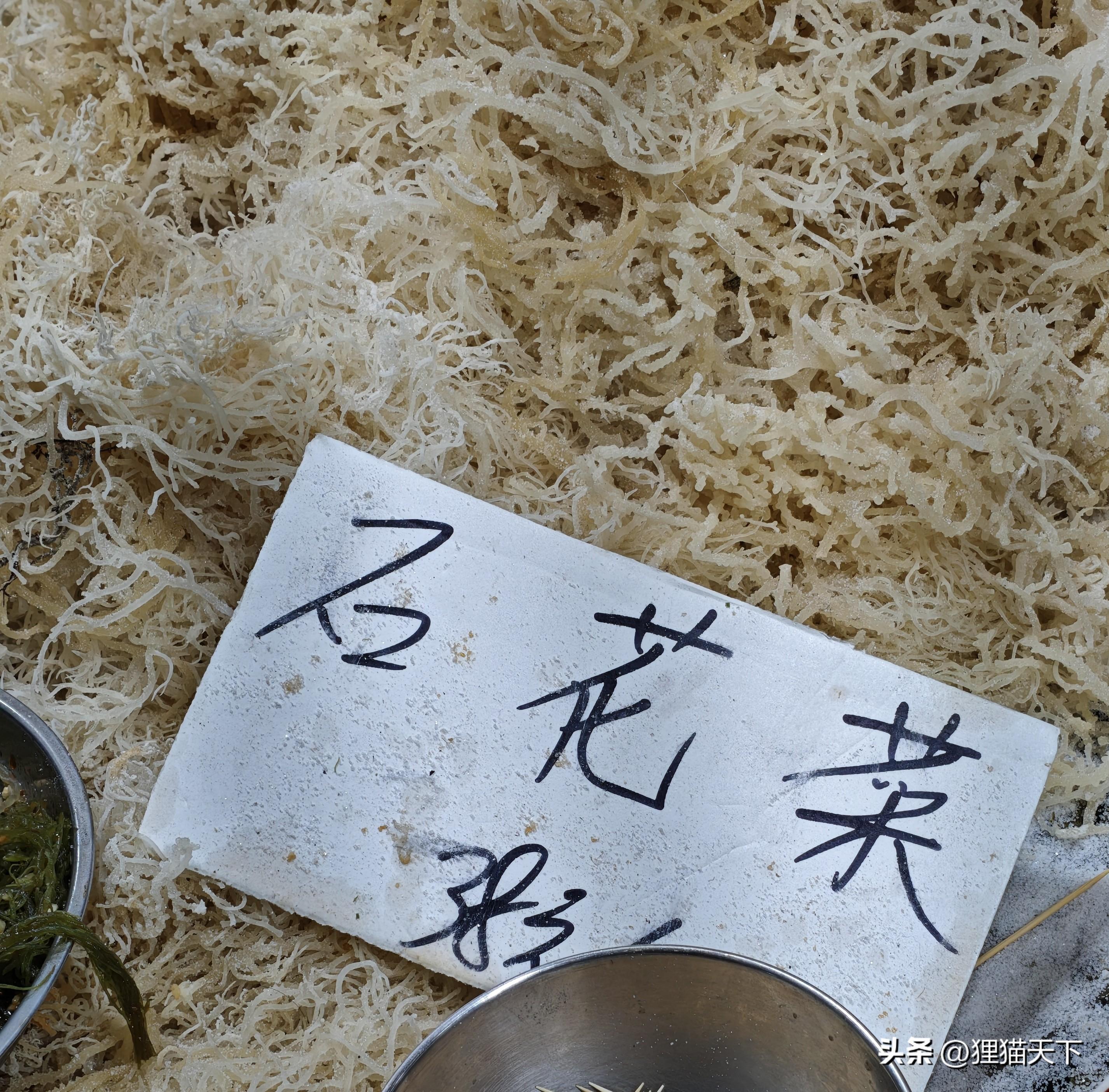 這是拌涼菜用的石花菜,產自沿海地區,屬於海產品。石花菜喫的時候用涼水泡發,洗乾淨之後撕扯一下,直接裝盤涼拌就能喫。記得千萬不要用熱水,也不用焯水,不要用熱油潑,石花菜遇熱就會化成黏糊糊,口感不好了。