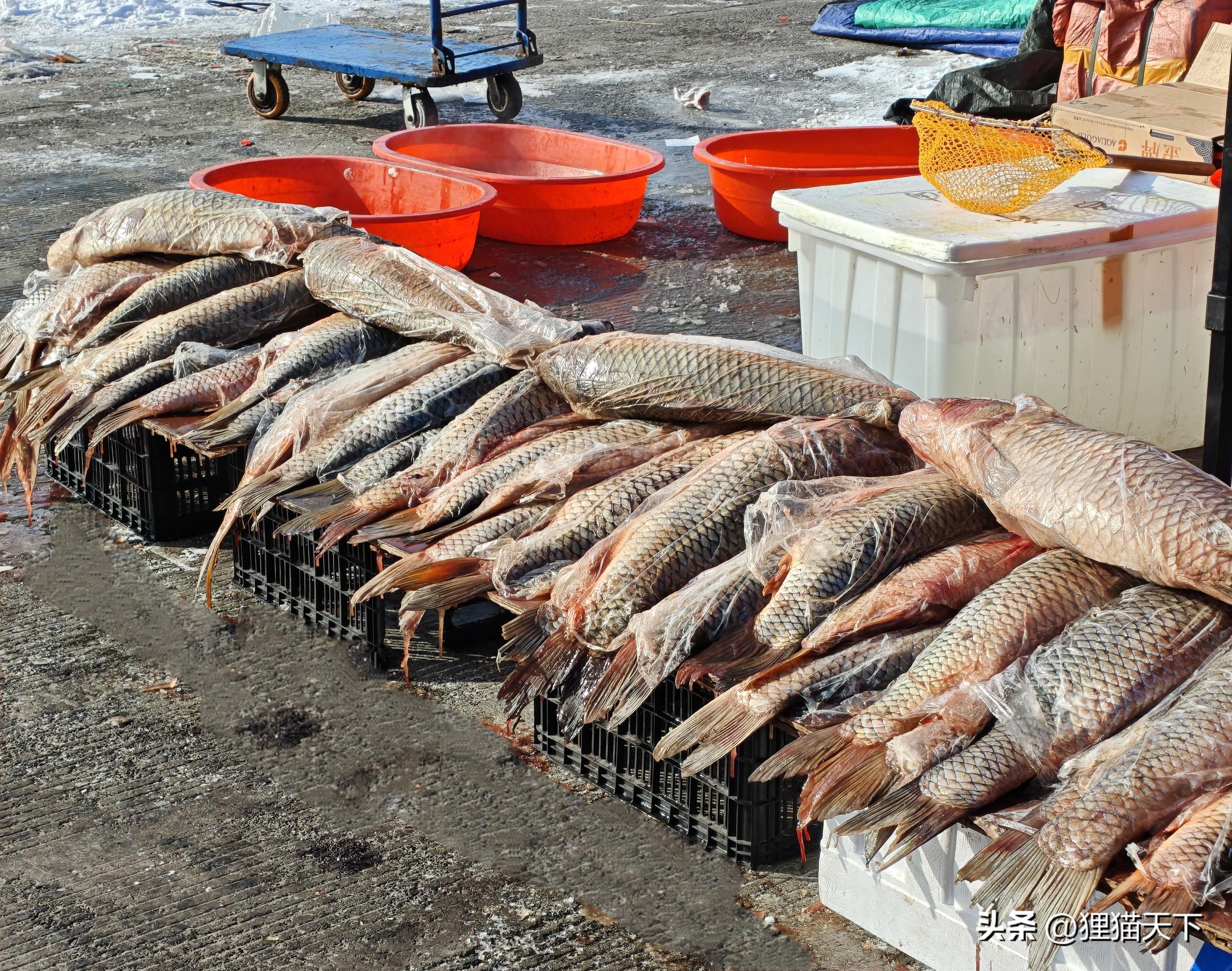 在凍貨區還看到冬捕的大魚,鯉魚草魚都個頭很大,這樣一條魚夠一家人喫好幾頓,再放點豆腐鐵鍋燉大魚,要是能有柴火竈就更好了。