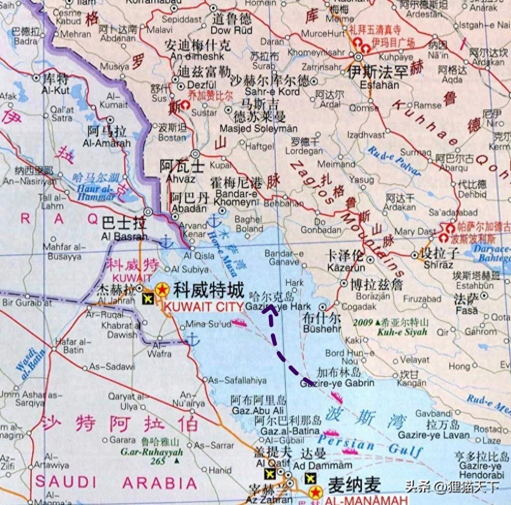 從地理位置來看,伊朗的哈爾克島位於波斯灣西北部,距離伊朗港口布什爾比較近,從這往西正對着科威特,那邊就有美方的基地。