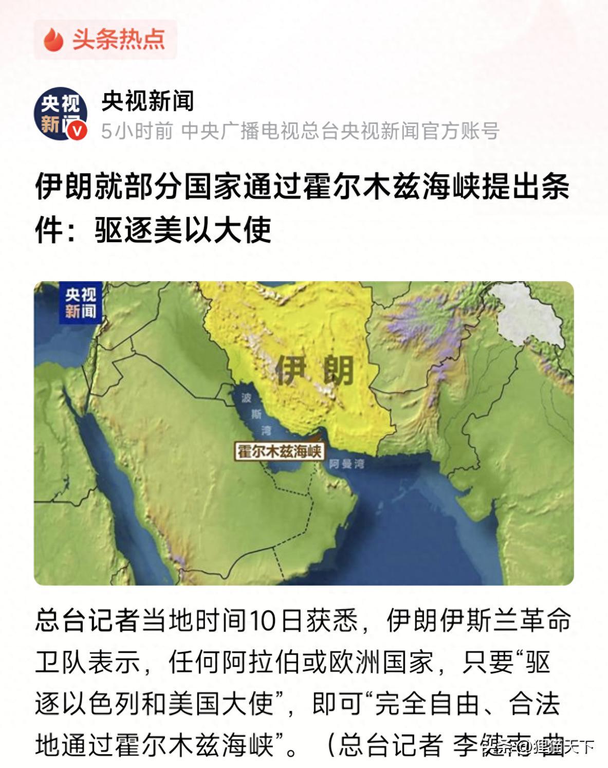 伊朗這個條件挺妙的,主要針對中東地區其他國家和歐洲國家,他們只要驅逐美以的大使,表明態度就可以自由航行通過霍爾木茲。不過這也是個難題,那些國家做不到。