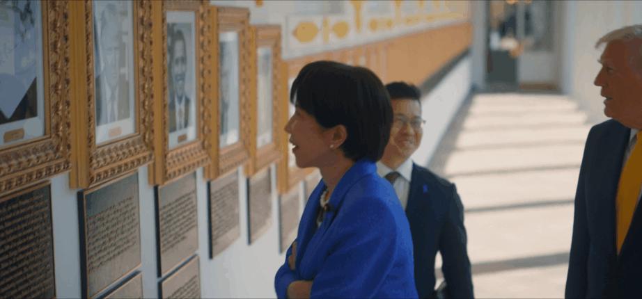 高市早苗訪美行程繼續,她在參觀對方辦公室的時候一個小舉動不太妥,這是在走廊觀看總統星光牆,看到現任美總統的照片,高市表現出的是崇拜,她的手勢和嘴型全是讚美之意。只見她張大嘴巴,伸展雙臂,表情十分崇拜。