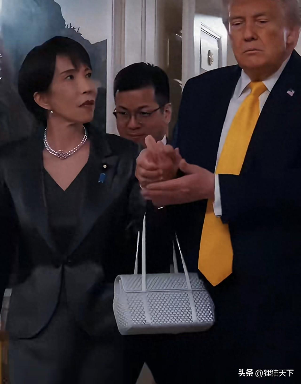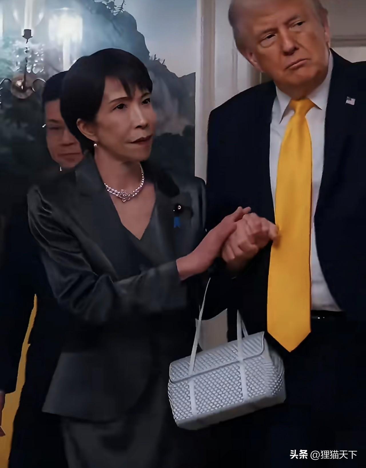高市早苗訪美,她的名場面還有晚宴環節的入場瞬間,當時他們並排走着,高市挎着包包明顯是精心打扮過了。沒想到對方突然拉起她的手還摸手,仔細看美總是雙手伸過來的,一手跟高市牽手,另一手摸了一下。此時高市的眼神有點喫驚,她都沒想到會這樣。