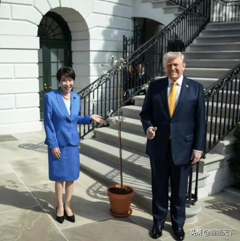 他們只是在會面擁抱之後,對外展示了其中一棵櫻花樹,這就是高市送的櫻花樹長這樣的,看起來多少有點寒酸,光禿禿的葉子和花朵,大家覺得這禮物拿得出手嗎?