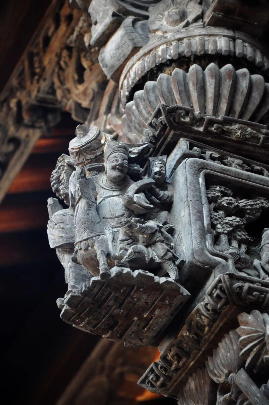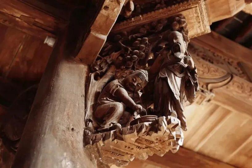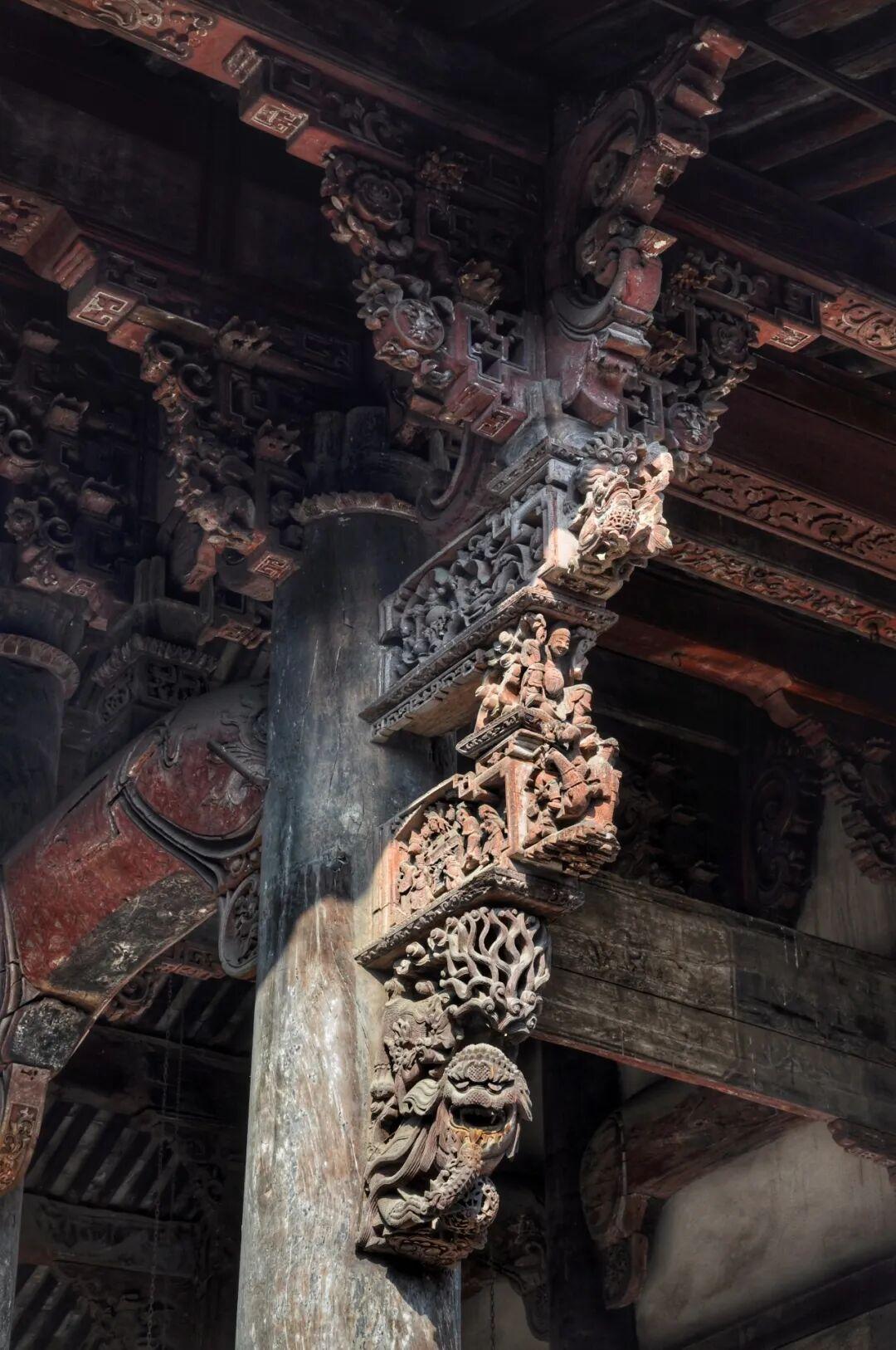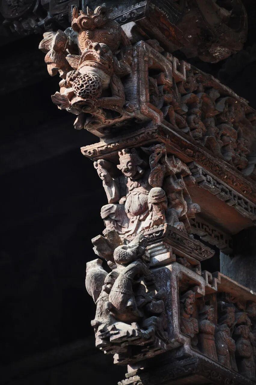 每一根牛腿都採用深浮雕、透雕甚至多層鏤空雕的技法,雕刻着複雜的戲曲故事、龍鳳獅象、神仙人物。