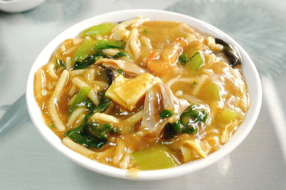 現在的沃面配料就非常豐富來,豬肚、河蝦、蛋皮、青菜、木耳……加澱粉勾芡,各種風味融合在一起,喫起來是比較爛糊的口感,有很濃厚的豬油香,鹹鮮軟乎。