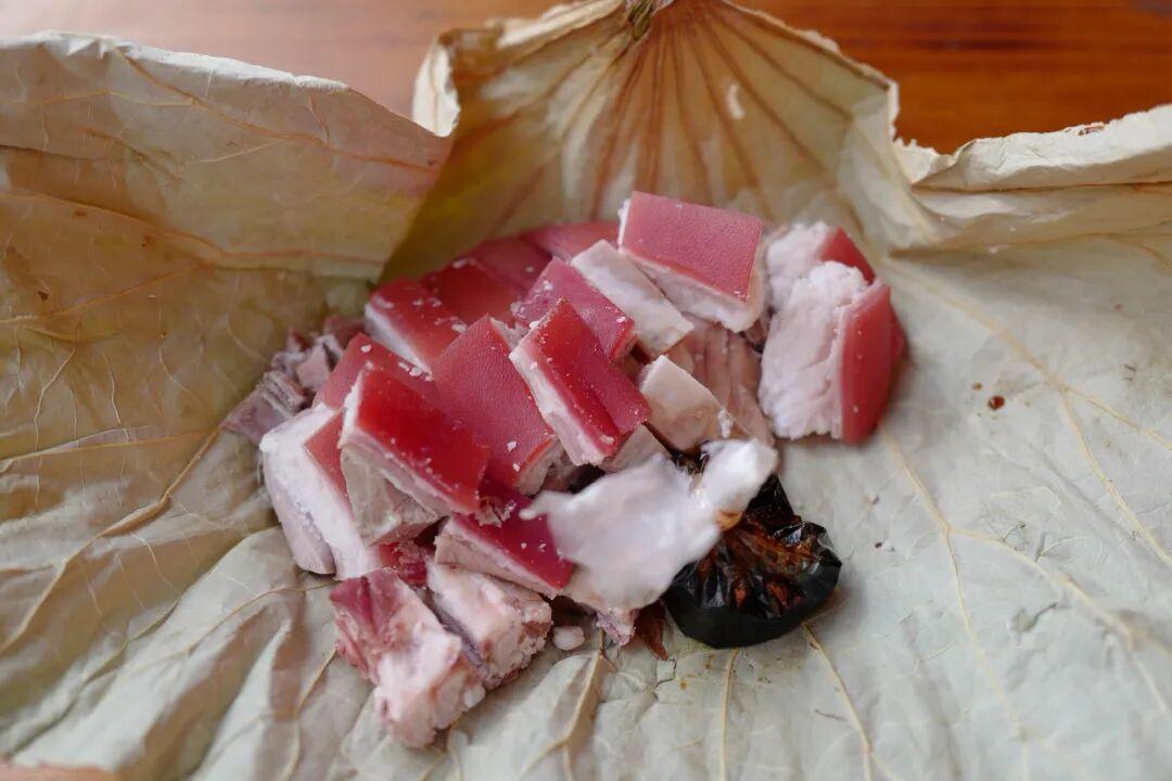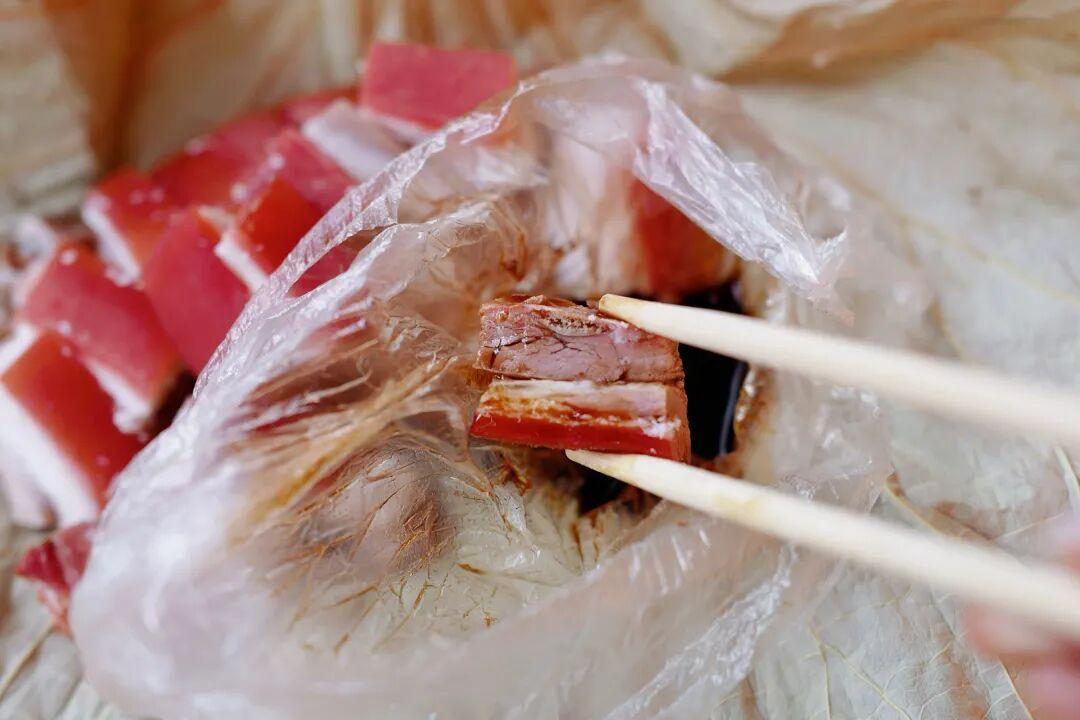 東陽的羊肉做法很獨特,羊肉要塗過羊血之後再進行熬煮,所以煮好之後的羊肉呈鮮紅色。賣的時候再用綠色的荷葉一包,除了賣相好看之外,喫起來更有一陣清香。