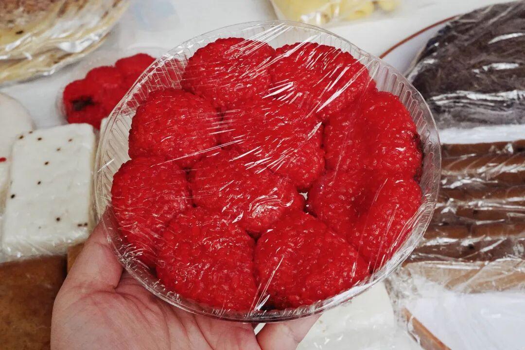 這家店有很多口味的糖洋,還有很多東陽特色的糕點,這個紅彤彤的“楊梅粿”人氣也很高喔。