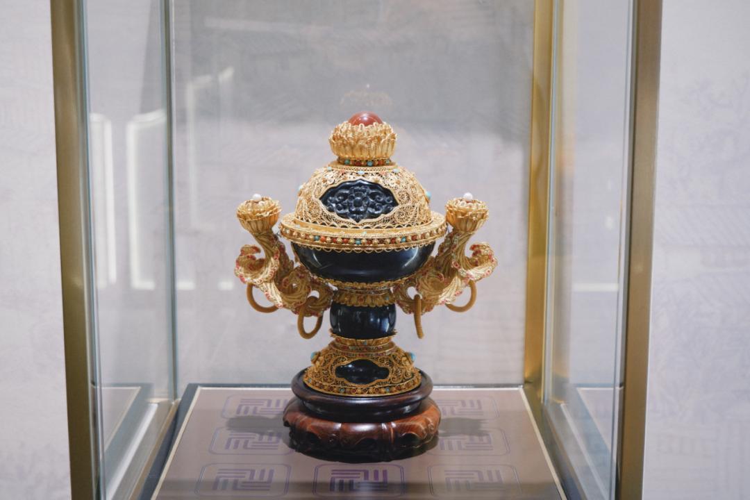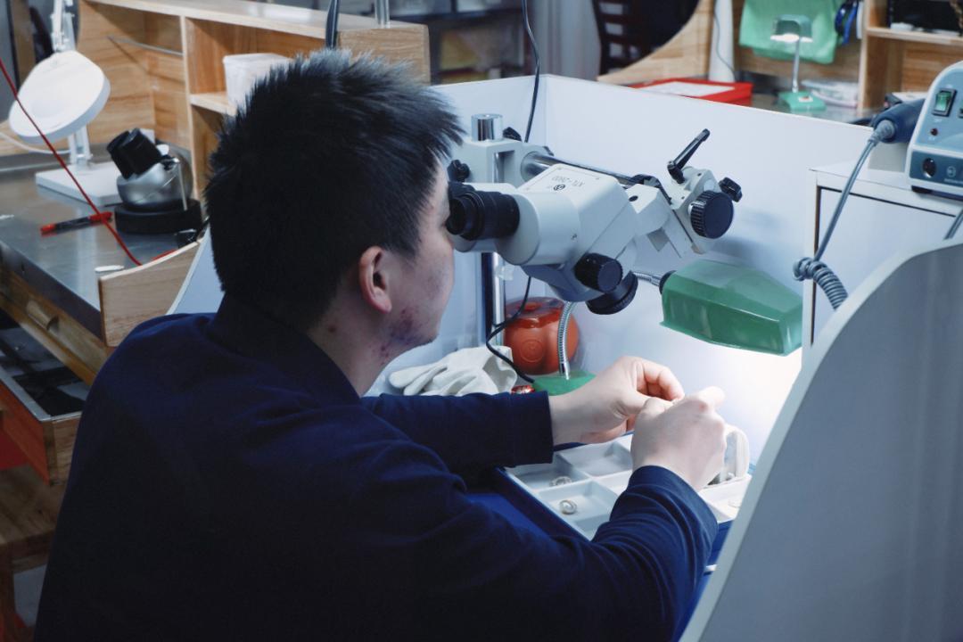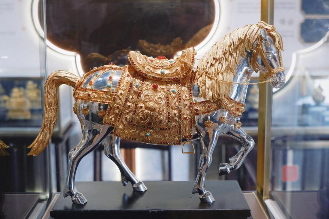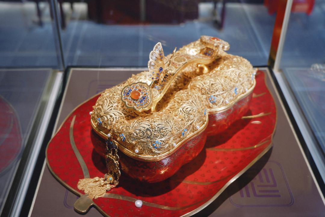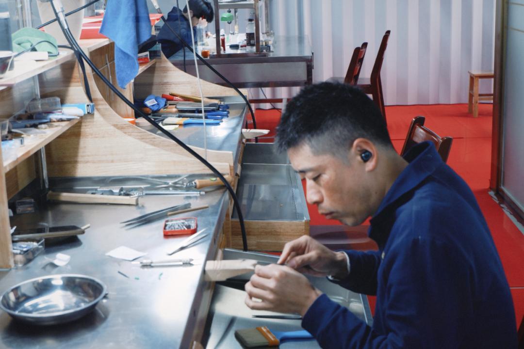你可以隔着玻璃看師傅們現場鏨刻、花絲鑲嵌,0.5毫米的金絲在他們手裏跟變魔術似的。