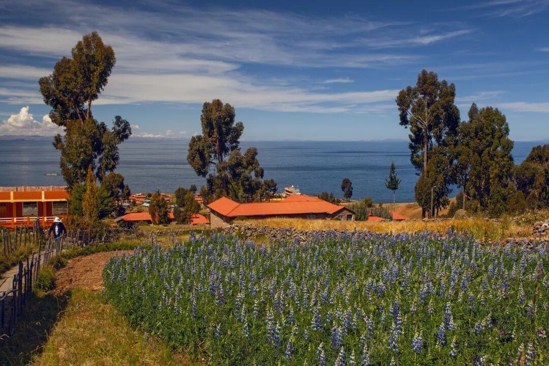 村長的家建在一個山頂上,面向着的的喀喀湖,岸邊有一個小沙灘。水浪掀起一道白鏈拍打着沙灘。陽光下,房子四周種植的花草奼紫嫣紅。我不由想到了那個總愛戴着一頂奇特的帽子的中國詩人,和他那句膾炙人口的詩句:面朝大海,春暖花開。