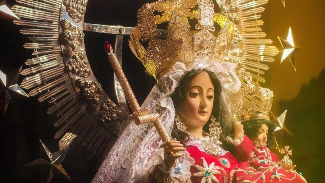 廣場上張燈結綵、人頭攢動。一側的普諾主教堂被彩燈裝飾得既莊嚴又喜慶,主導着節日的氣氛。人們翹首以待。不久,鼓樂齊鳴,一尊高大的聖母像在萬衆歡呼中從廣場的一側緩緩進入。聖母像身披白紗,頭戴華冠,被彩色花卉簇擁着,在強烈的燈光的照耀下,在黑夜裏閃耀着神聖的光芒。無數熱烈的目光,無數雙高舉手機的雙臂迎向她,跟隨着她繞場一週,來到了主教堂前。禮花齊放,祕魯最大的集宗教慶典和傳統音樂舞蹈大賽爲一體的狂歡節正式開始了。