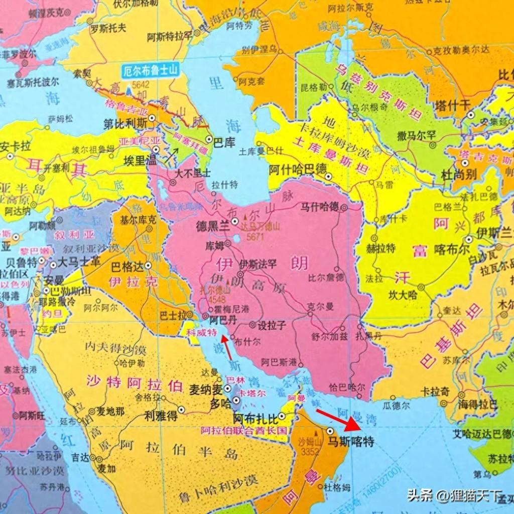 伊朗現在有兩個關鍵位置,霍爾木茲海峽和哈爾克島。這兩個位置如圖所示,霍爾木茲海峽東面是阿曼灣,西面是波斯灣,這是石油運輸關鍵航道,伊朗的阿巴斯港就在霍爾木茲海峽北岸。