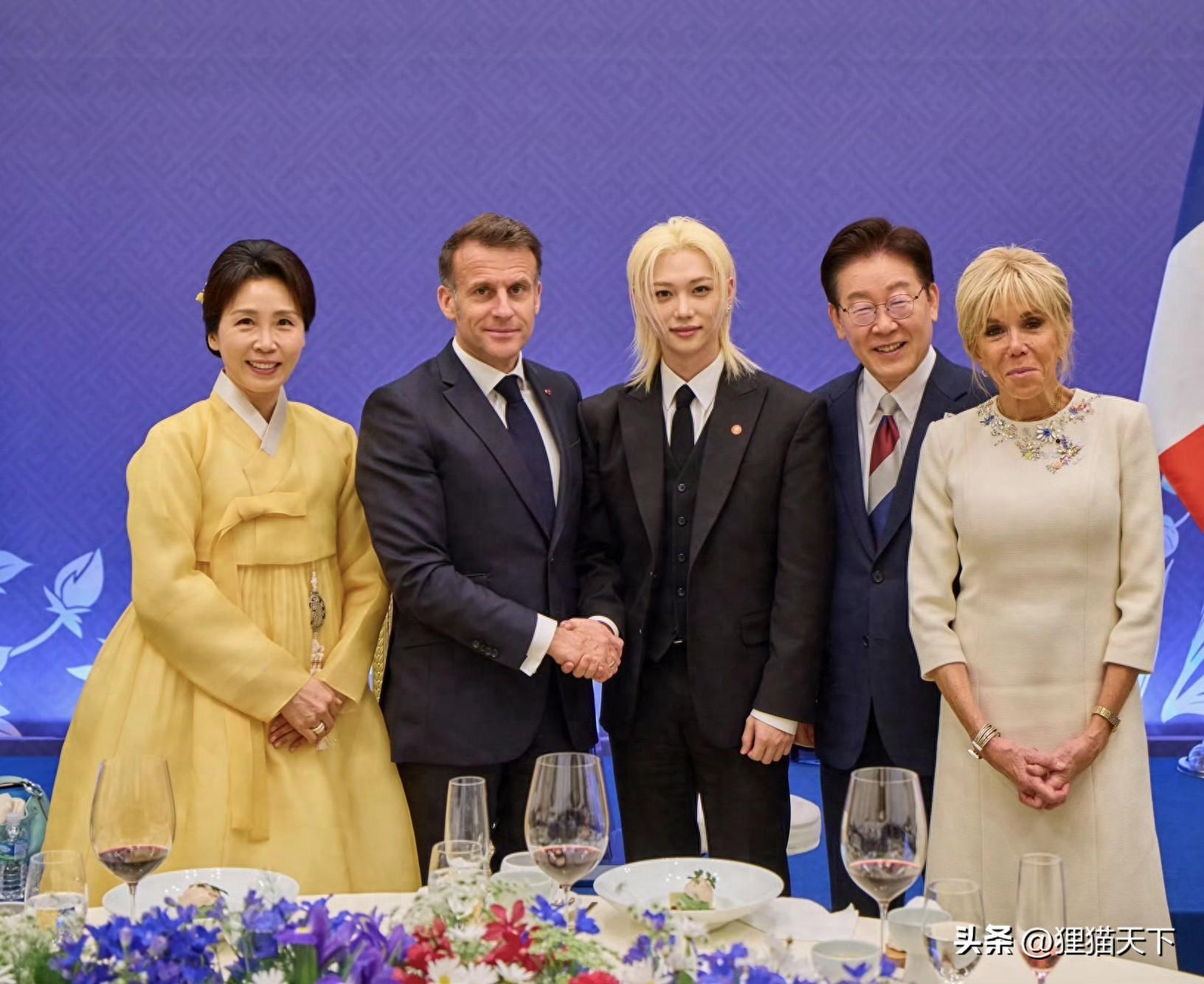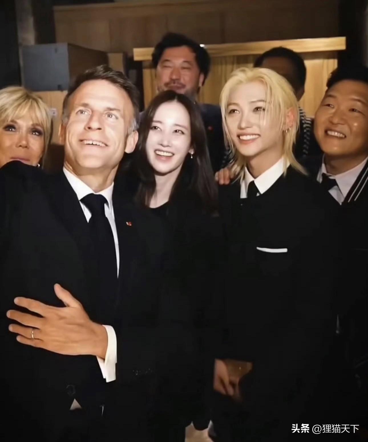 這是馬克龍在韓國訪問時的合影,由於恰逢韓法140週年,韓方找了好多韓國明星來捧場。包括合影中間的李龍馥,他是這次韓法140週年紀念名譽大使,才得以跟李在明和馬克龍合影。