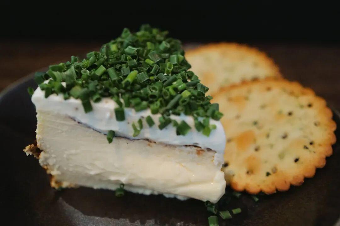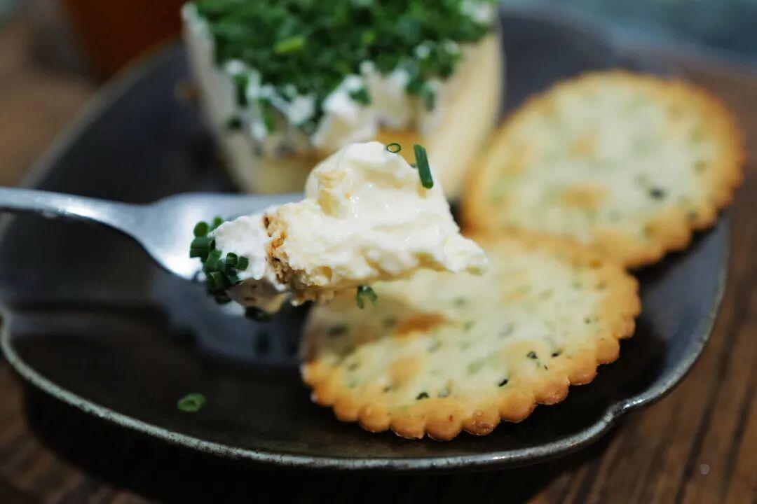 蛋糕體部分是孔泰芝士和蒜香奶酪,奶味醇厚,流心質地,入口非常順滑。可以搭配香蔥餅乾一起喫,口感融合得很好。