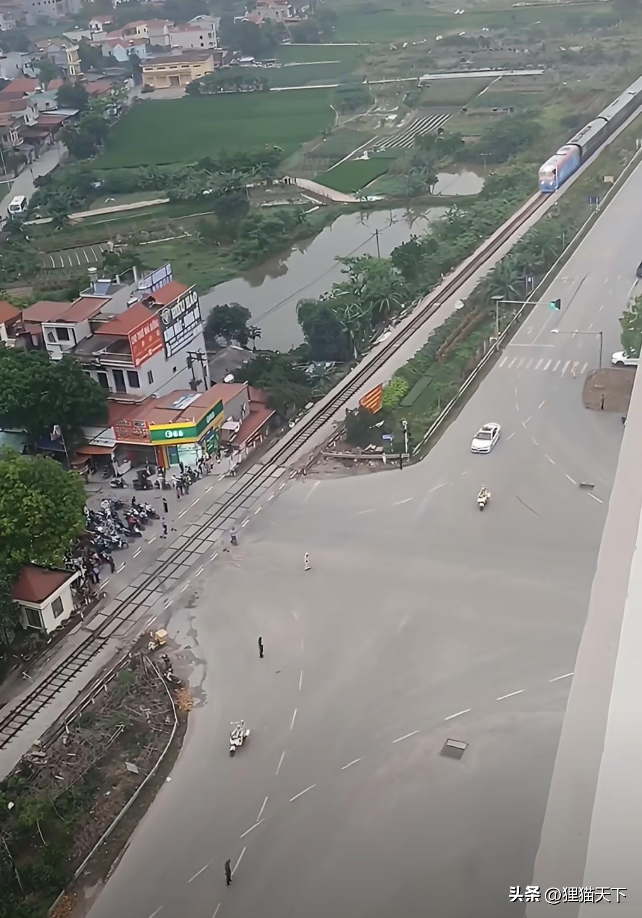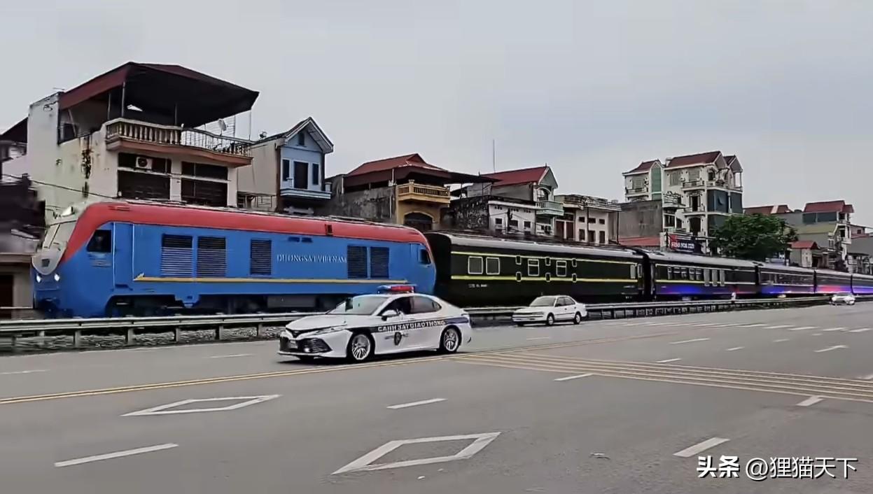 這趟火車駛入越南之後,沿途還有車隊在旁邊的公路上開道護着。可以看到最前面有摩托車開路,後面跟着汽車,然後纔是旁邊的鐵路有列車經過,這就是蘇林乘坐的火車。