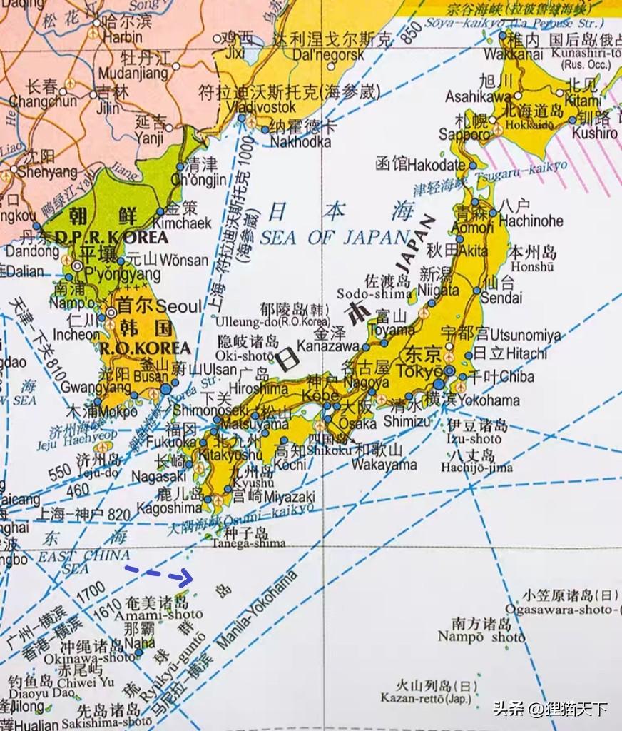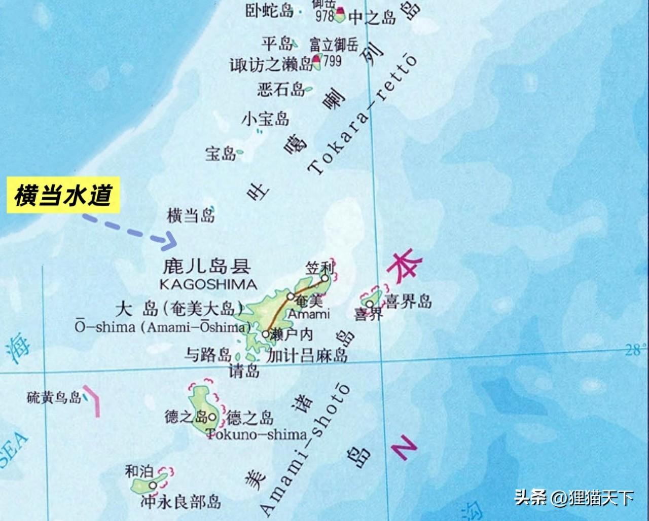 橫當水道在哪?如圖所示,這是琉球羣島北部的一條水道,在奄美大島與橫當島之間,周圍還有吐噶喇列島以及奄美諸島。